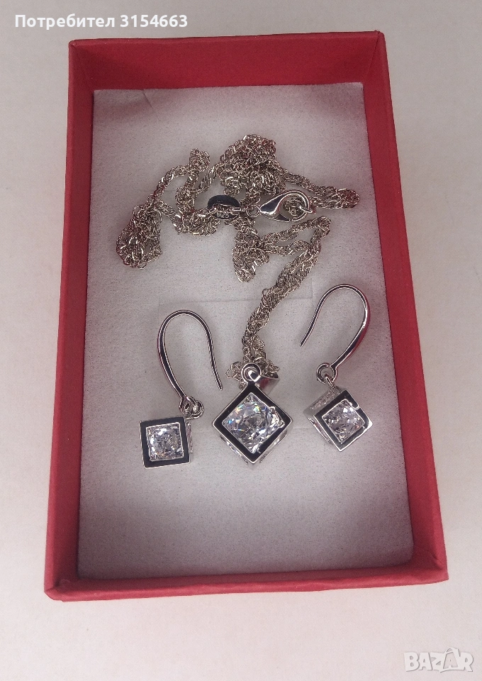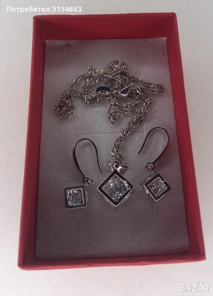 Комплект колие и обици Размери на колието: 0,8 см на 0,8 см. Дължина на верижката 46 см. Размери на обиците: 0,6 см на 0,6 см. В подаръчна кутия.
