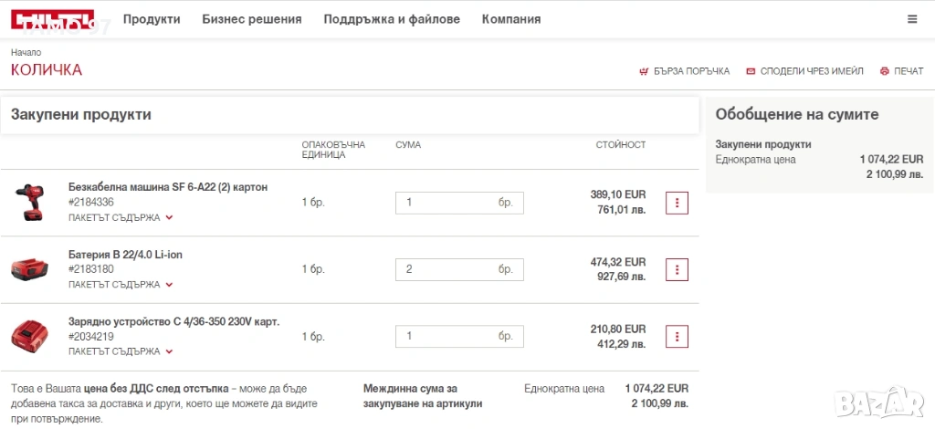 Магазинската цена на комплекта с по-малките батерии 4.0Ah е: 1 074евро БЕЗ ДДС (С ДДСТО е 1 288евро)