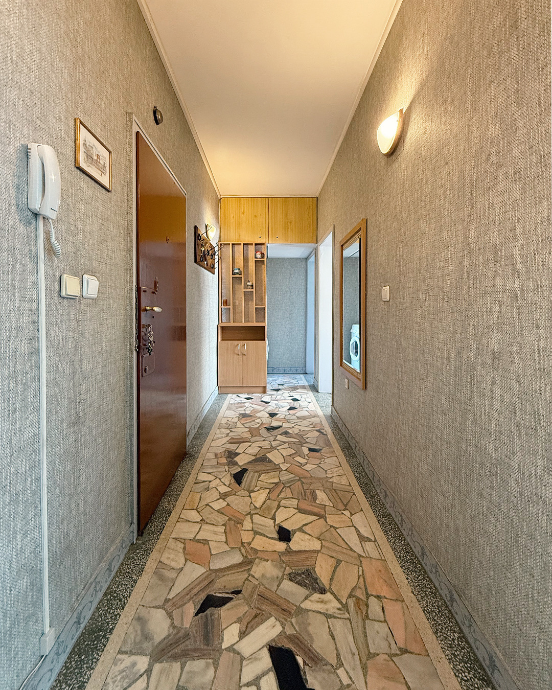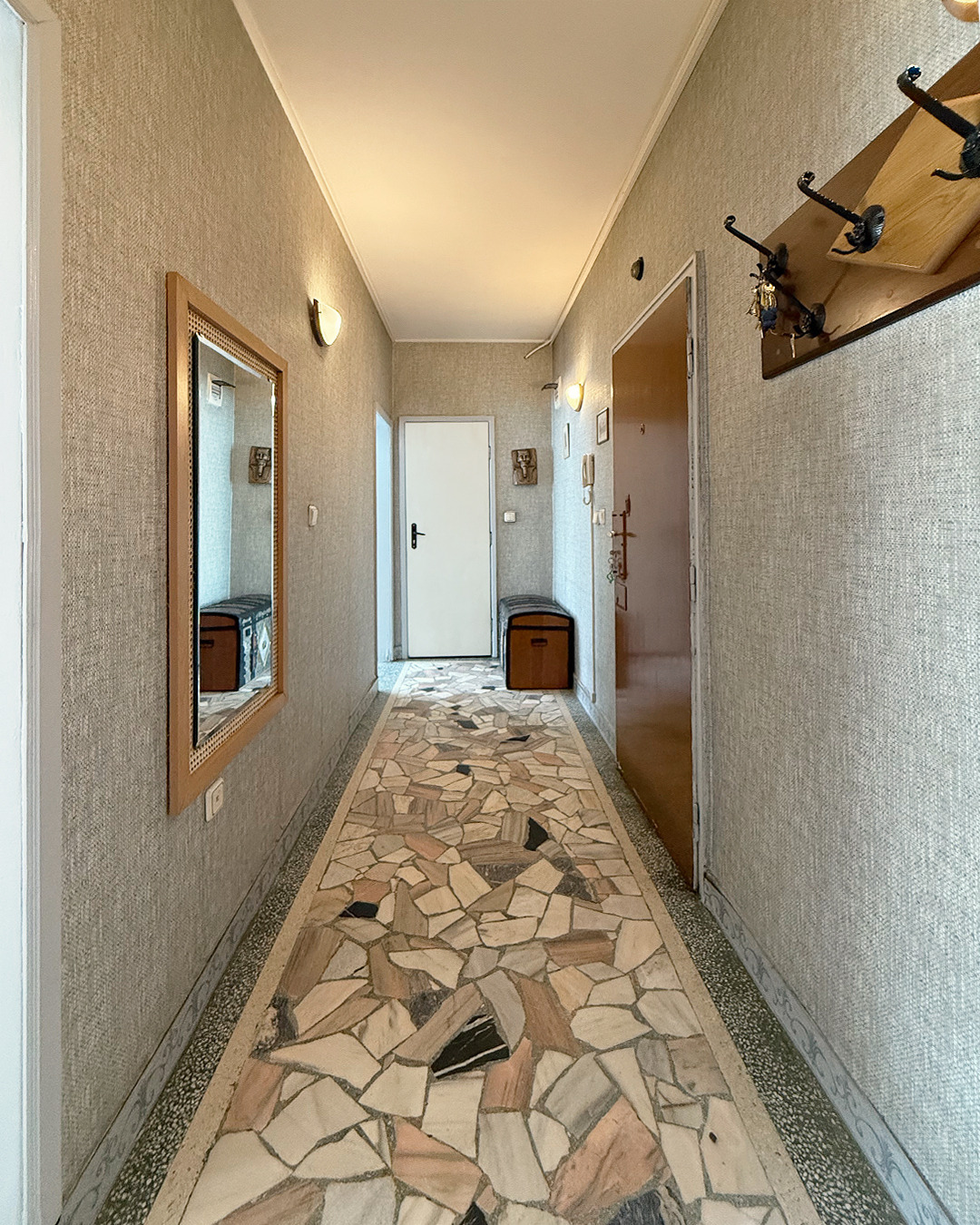 Разпределението е: коридор, хол, кухненски бокс с трапезария, спалня, баня с тоалетна, тераса с достъп от кухнята и хола.