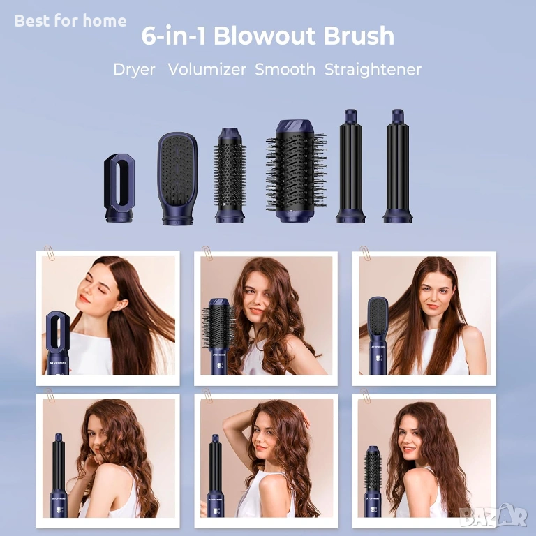Стилизатор за коса: Този комплект 6 в 1 с въздушен стилизатор се предлага с 6 сменяеми четки и прави сушенето със сешоар, изправянето, къдренето, придаването на обем и масажирането на скалпа изключително лесно. С кръглата четка за коса можете лесно да създавате различни прически за различна дължина на косата. Изящната опаковка го прави идеален подарък за приятели, семейство или други близки, особено като коледен подарък за жени.