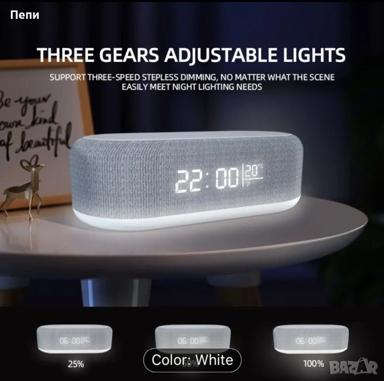 Лед часовник с три нива на подсветка. Показател на часа и температурата. И безжично зарежда не телефона след като бъде поставен върху часовника. За повече информация на лично
