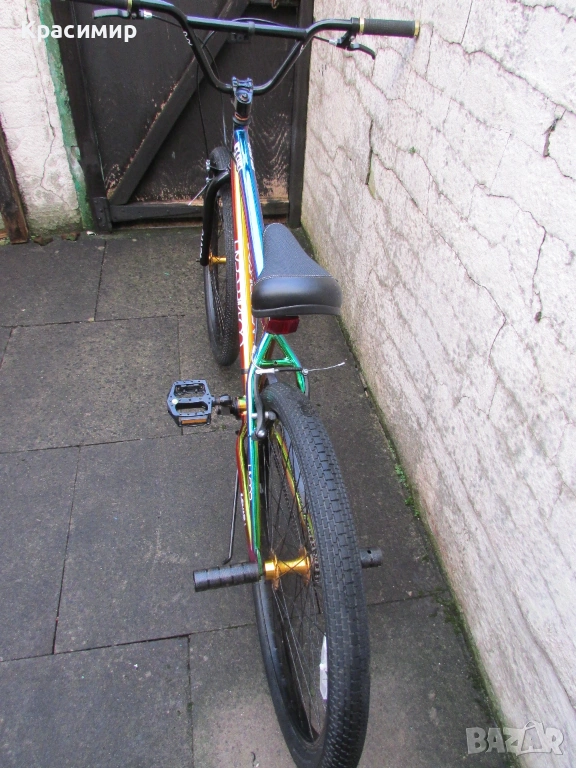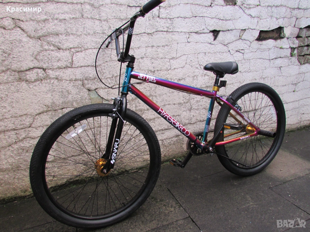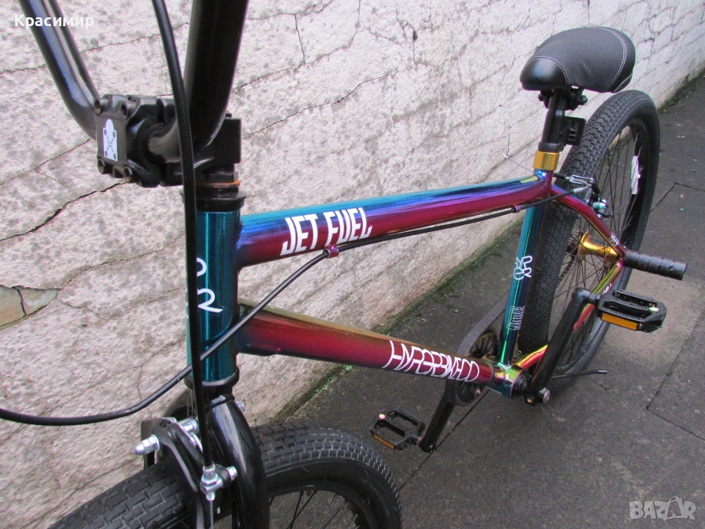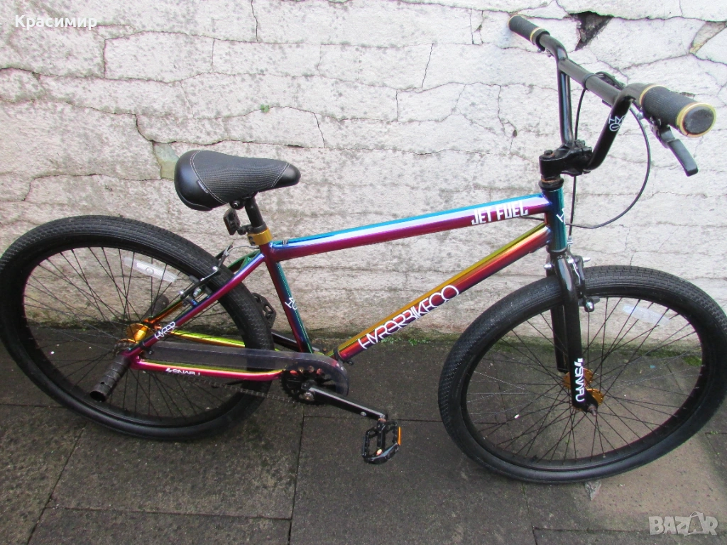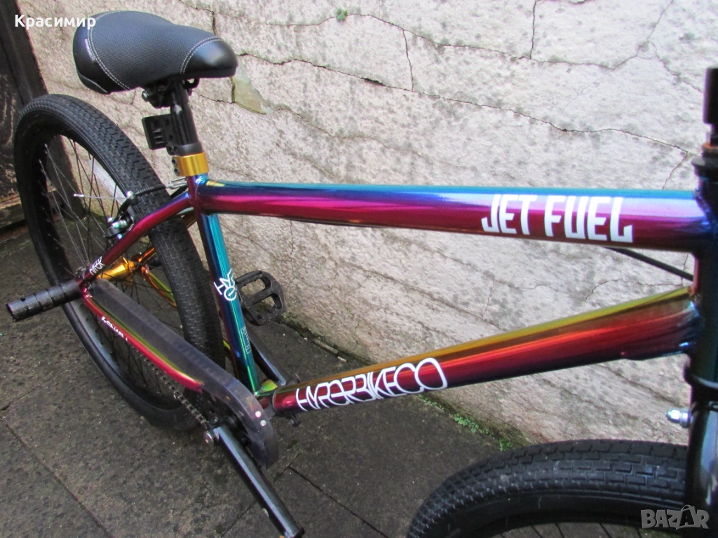 BMX велосипед Hyper Jet Fuel с 26 инчови капли, с персонализирано многоцветно покритие Jet Fuel, точно като тези, карани от професионалния отбор на BMX атлети на Hyper. Изработен е от здрава стоманена рамка, кормило от алуминий, закрепено чрез масивна алуминиева лапа и е с повдигнати дръжки със златни анодизирани заключващи пластини за максимален контрол. Веригата е с 3 - частичен хромомолибденов курбел с алуминиеви платформени педали за стабилно возене, а колелата са със златни анодизирани алуминиеви главини за стил и плавно возене. Задната V - образна и предната челюстна спирачка са алуминиеви, съчетани със златни анодизирани алуминиеви спирачни лостове, както е и скобата на седалката. Максимално натоварване - 135 кг. Велосипедът е като нов. Само лично предаване.