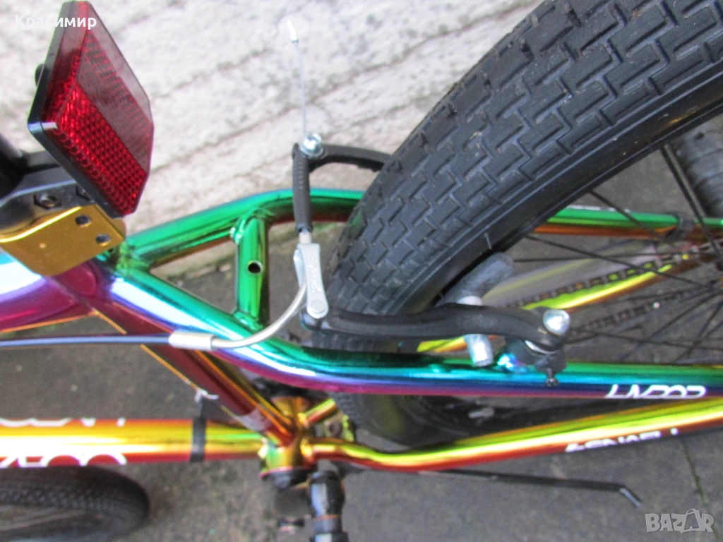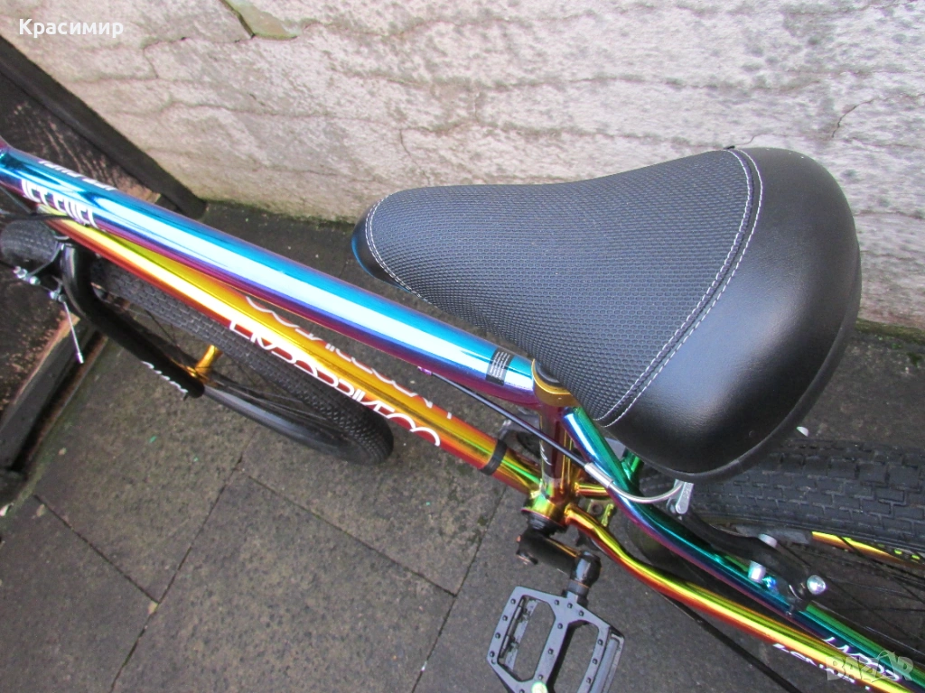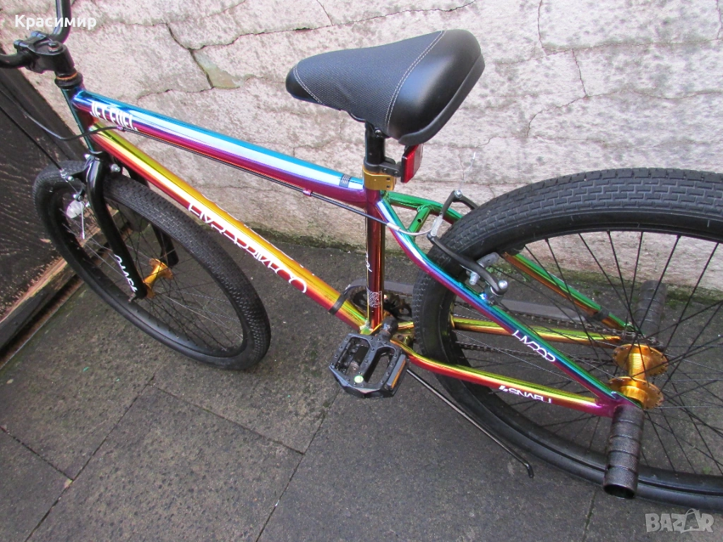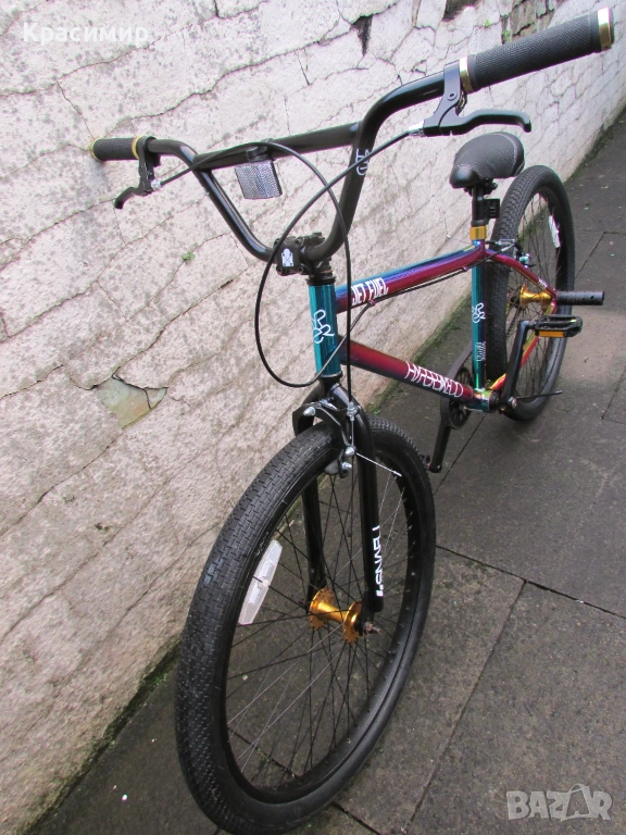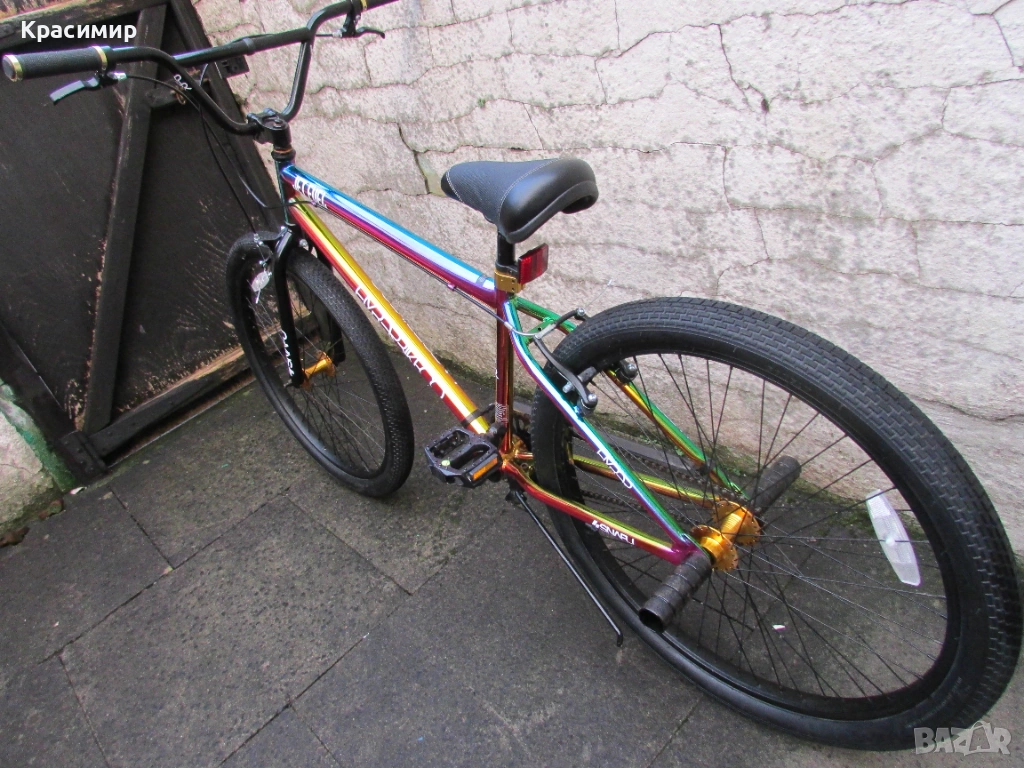 BMX велосипед Hyper Jet Fuel с 26 инчови капли, с персонализирано многоцветно покритие Jet Fuel, точно като тези, карани от професионалния отбор на BMX атлети на Hyper. Изработен е от здрава стоманена рамка, кормило от алуминий, закрепено чрез масивна алуминиева лапа и е с повдигнати дръжки със златни анодизирани заключващи пластини за максимален контрол. Веригата е с 3 - частичен хромомолибденов курбел с алуминиеви платформени педали за стабилно возене, а колелата са със златни анодизирани алуминиеви главини за стил и плавно возене. Задната V - образна и предната челюстна спирачка са алуминиеви, съчетани със златни анодизирани алуминиеви спирачни лостове, както е и скобата на седалката. Максимално натоварване - 135 кг. Велосипедът е като нов. Само лично предаване.