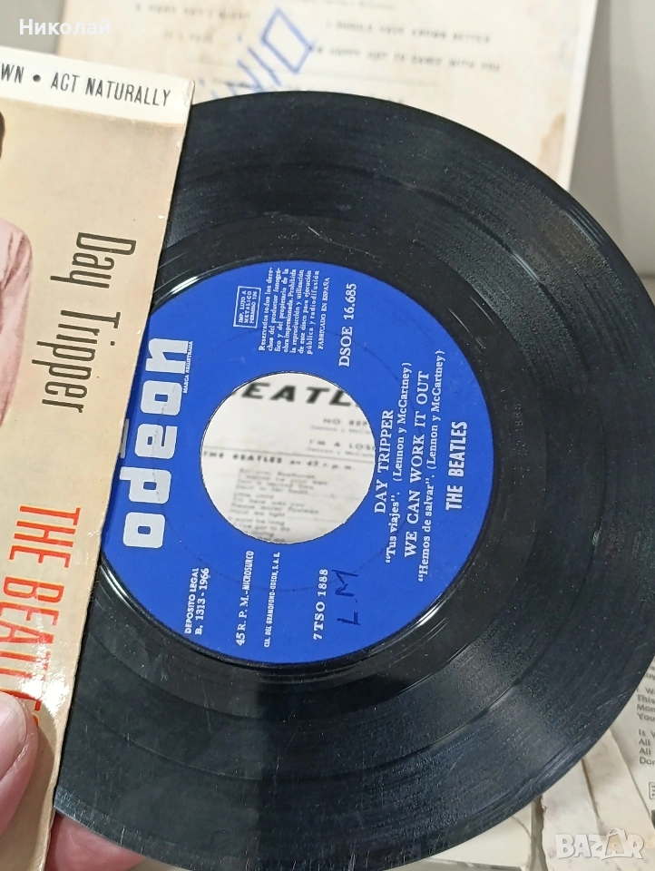 Продавам оригинални винилови плочи и обложки на The Beatles (Ticket to Ride, Day Tripper и др.).