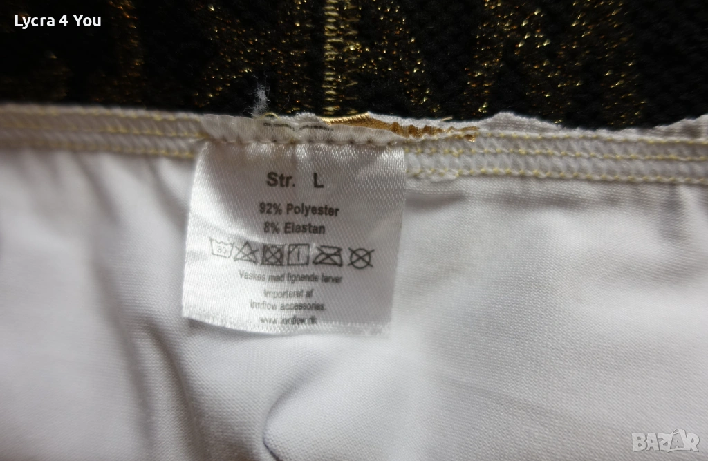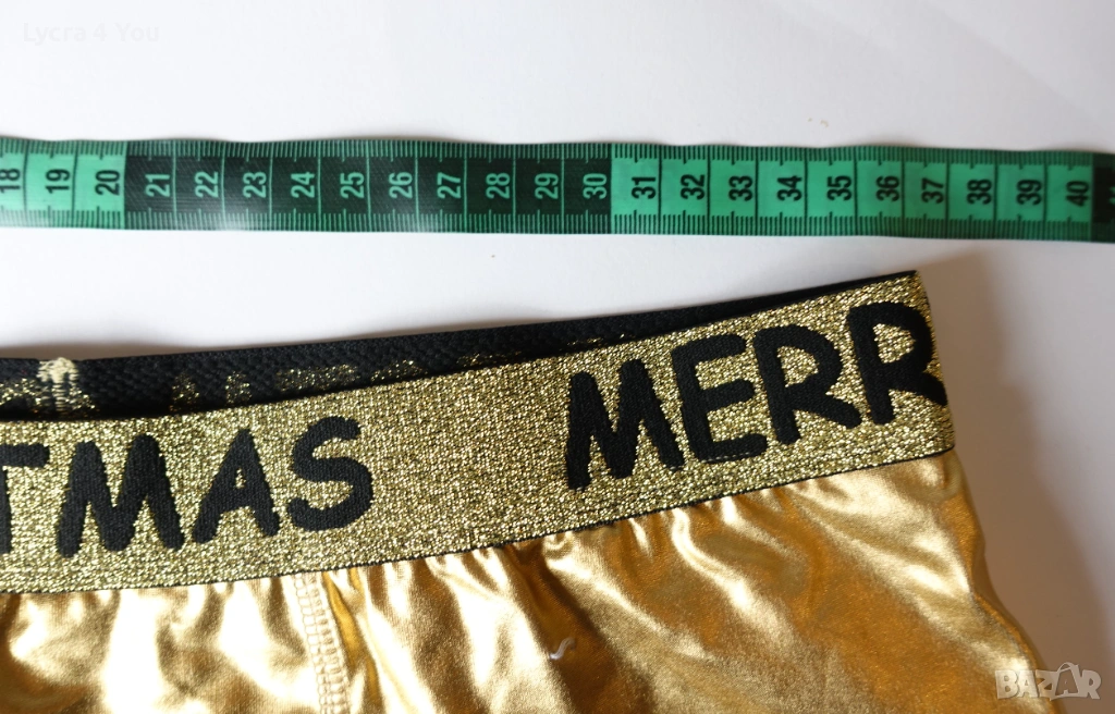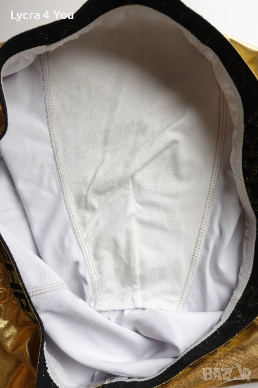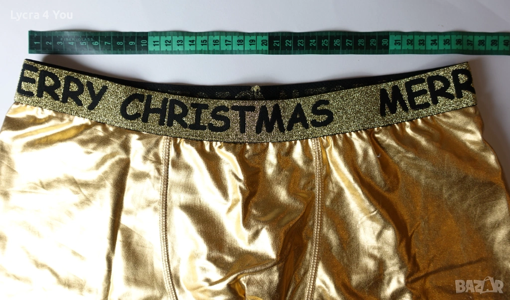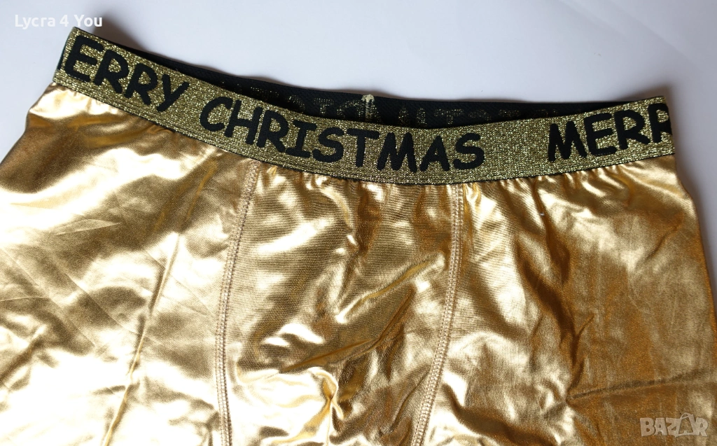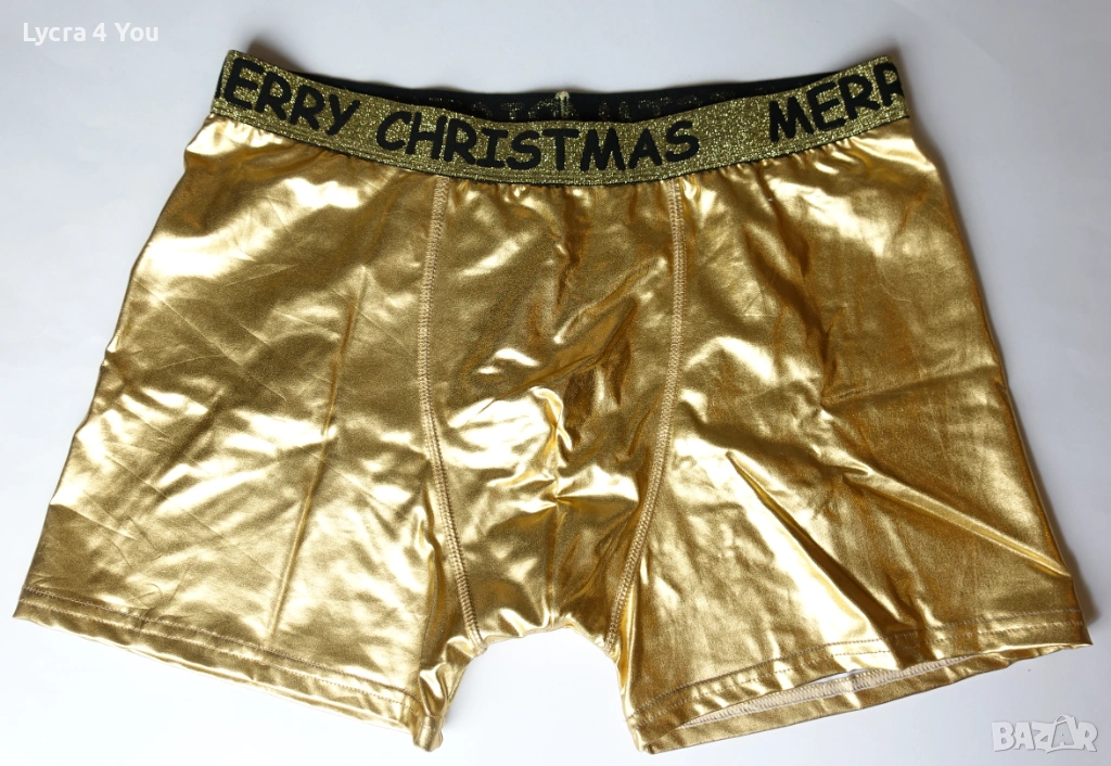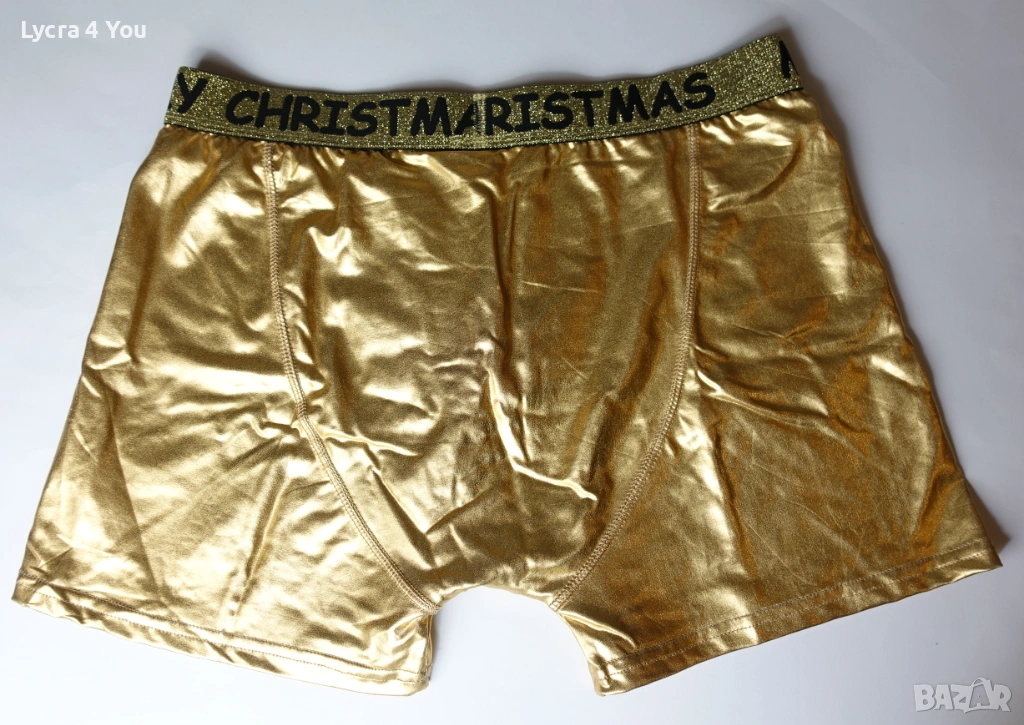 Нови мъжки боксерки в златист цвят от еластична синтетична мека материя с еластичност (92% полиестер и 8% еластан), наподобяваща еко кожа. Отвътре с бяла памучна подплата при слабините, което ги прави подходящи за по-дълго ползване като бельо.