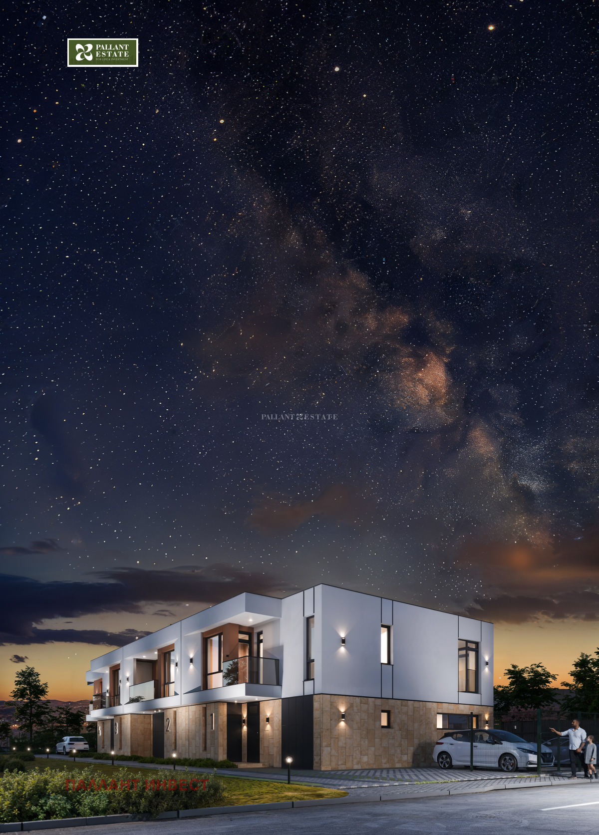 Комплекс от квартален тип с общо озеленено пространство, видеонаблюдение и по 2 паркоместа за всяка къща. Продава се завършен по БДС стандарт от строител инвеститор.
