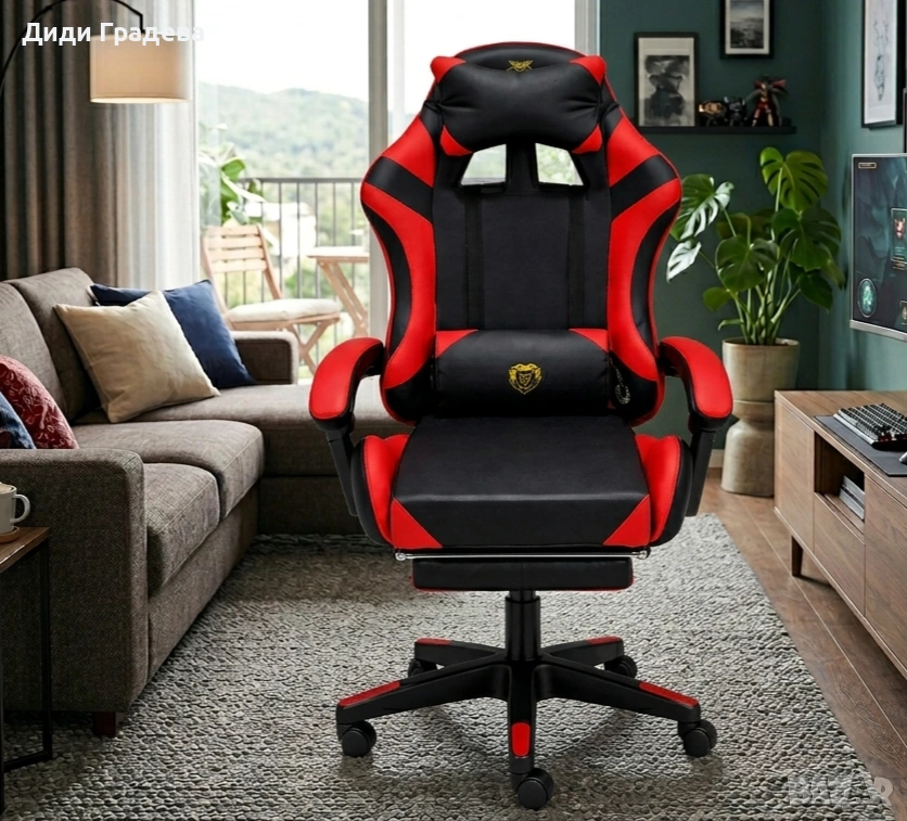 Удобен геймърски стол с поставка за крака и масажна лумбална възглавница, Черно-червен