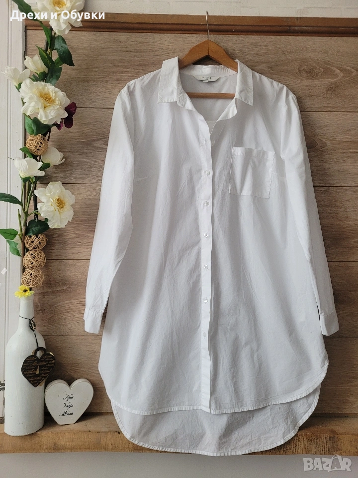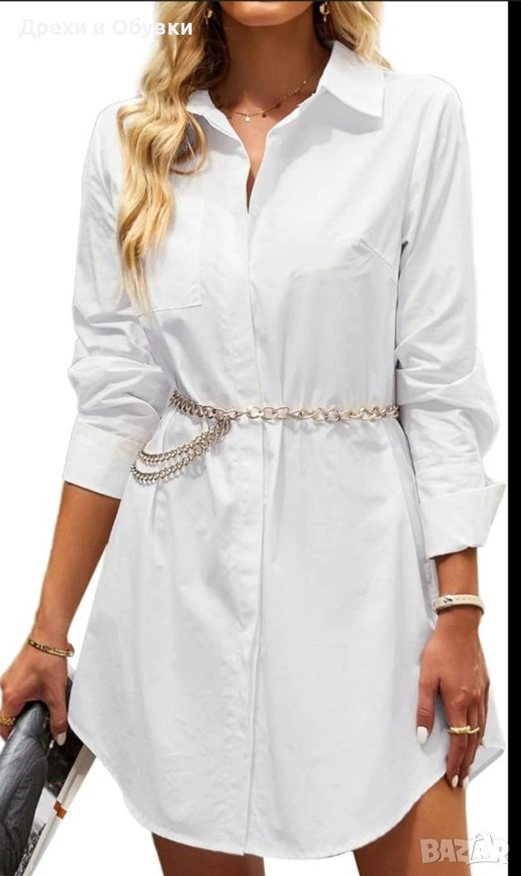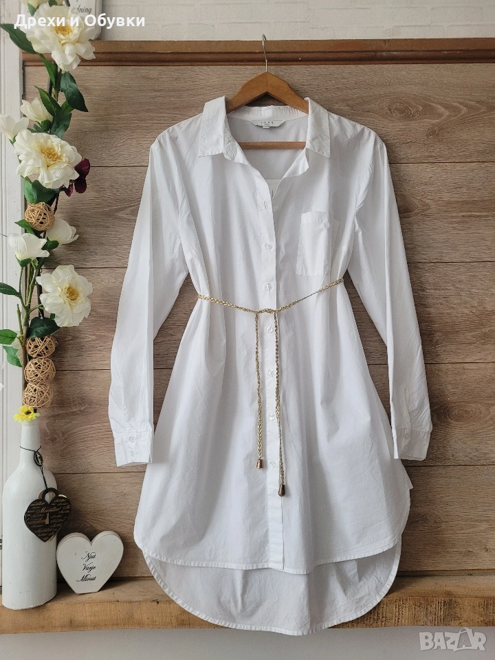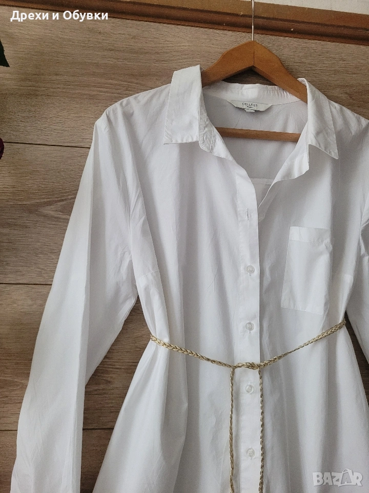 Бяла рокля тип риза CELLBES. 100% памучна материя Комбинира се лесно с всякакъв вид аксесоари, както за ежедневна , така и за елегантна визия. С кецове, сандали или елегантна обувка според желания аутфит. Размер по етикет 38/40 М/Л Състояние: не е носена Цена 24€