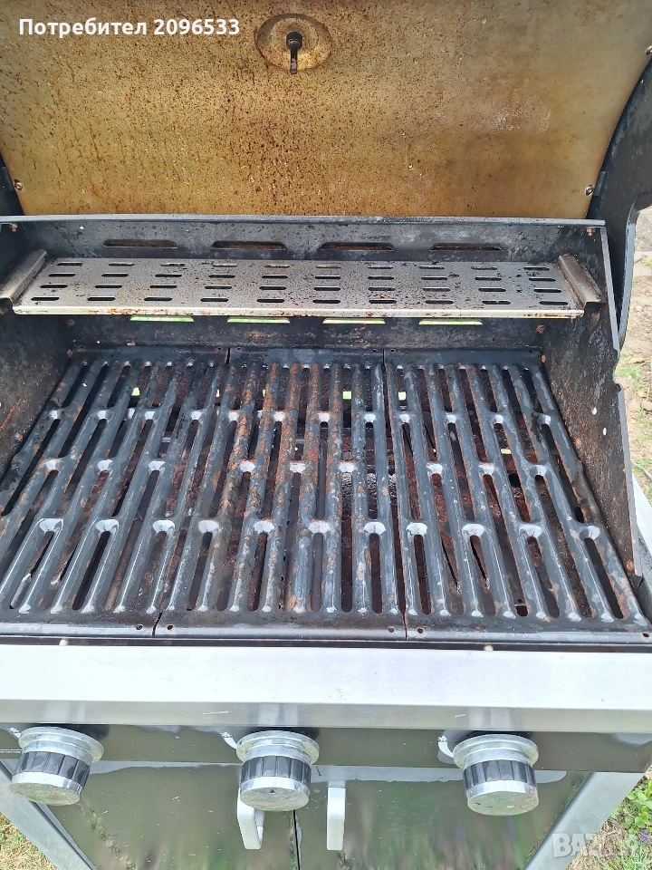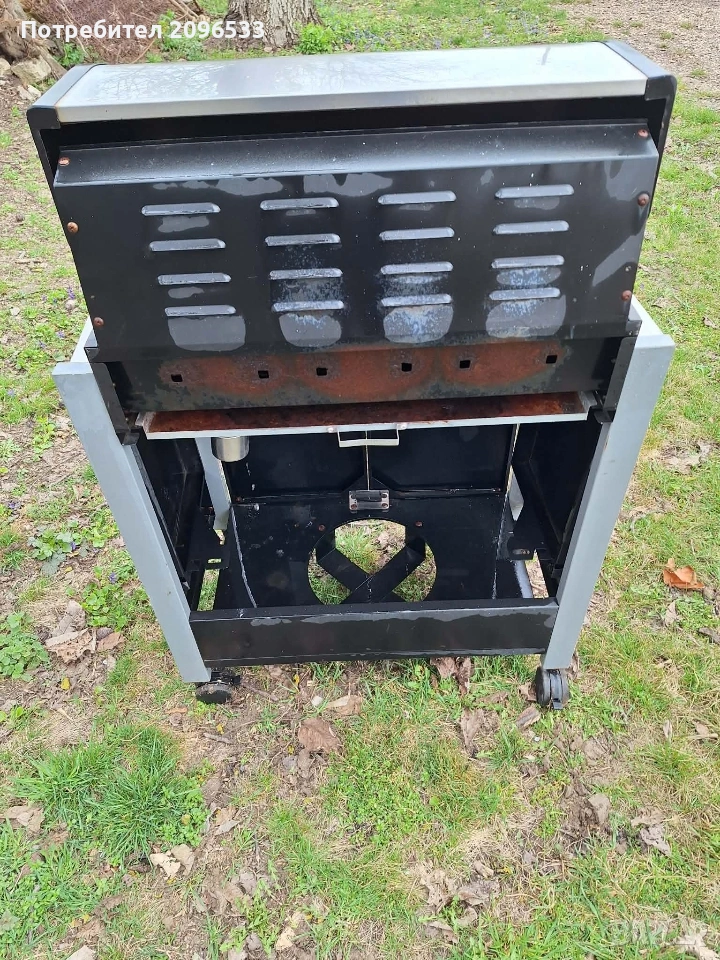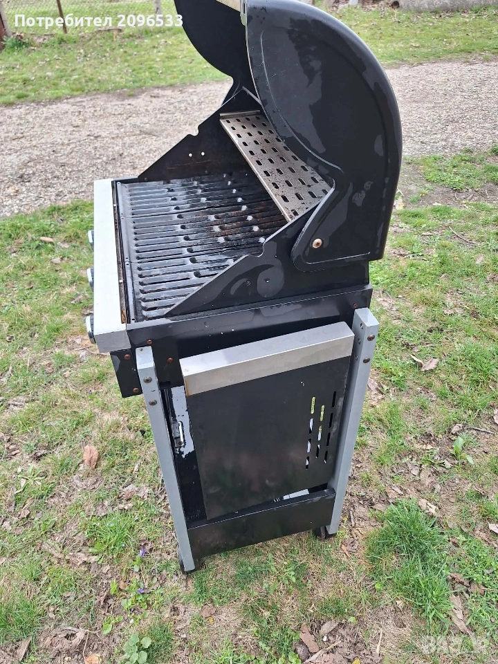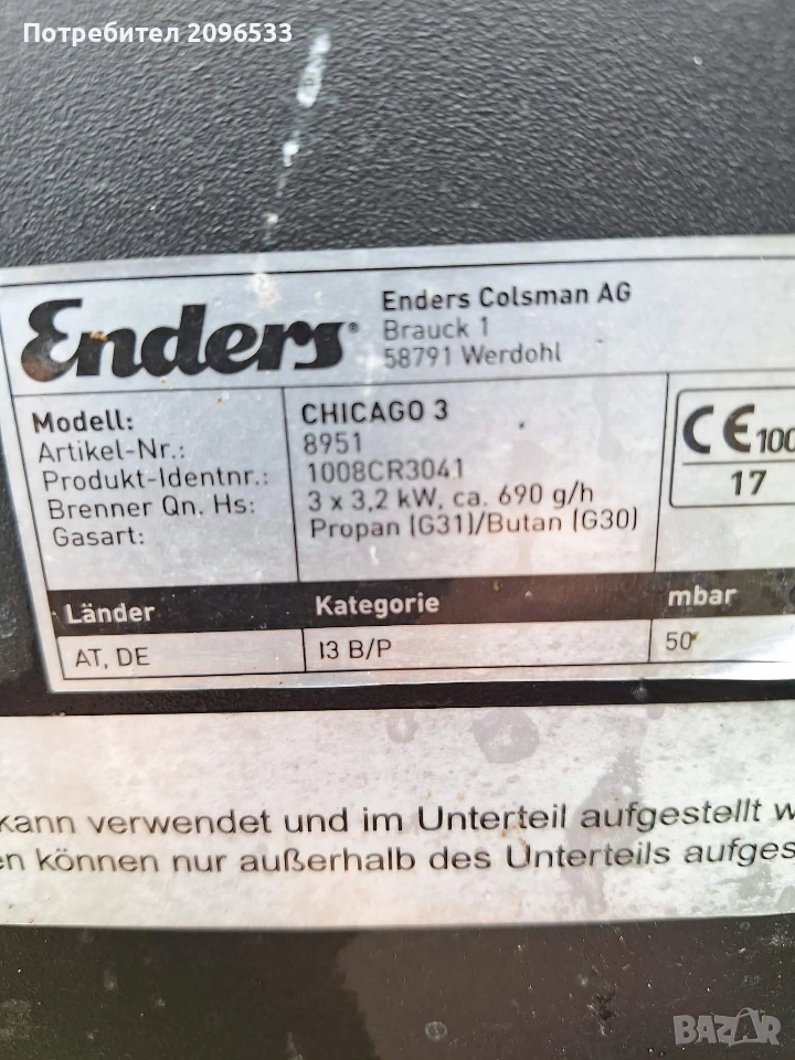 Газово Барбекю ENDERS CHICAGO 3 Равномерно разпределяне на топлината чрез специално разработена система за обгръщане на пламъка. Капак от неръждаема стомана. Вграден прецизен термометър. Странични плотове 3 безстепенно регулируеми горелки от неръждаема стомана 3 скари от неръждаема стомана (подходящи за миялна машина). Полезна задържаща топлината скара от емайлирана стомана. Тава за мазнината. Шкаф за съхранение (има място и за 5 кг. газова бутилка) Фронтбленди, покриващи пламъка от неръждаема стомана. Обща мощност – 9,6 kW. Горелки – 3 х 3,2 kW. Пиезо – запалване. Размери на скарите см/см² : 60х42 /2520 Включени газов маркуч и редуцир – вентил на 50 mbar. Нагреваема площ за поддържане на топлина на скарата см: 45х11 см Външни колела: 4 Размери: Ш 124х Д 51х В 108 Барбекюто е в отлично състояние.