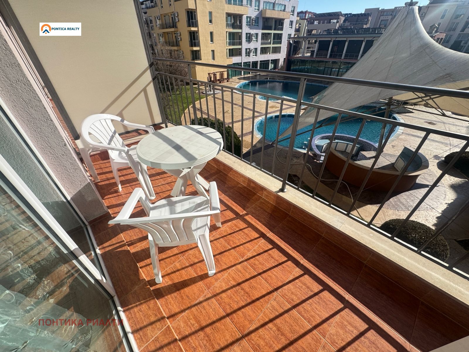 Комплексът предлага басейн, ресторант, pool-бар, детска площадка, паркинг, озеленени площи и 24/7 охрана. Сграда с Акт 16 и отлична поддръжка.