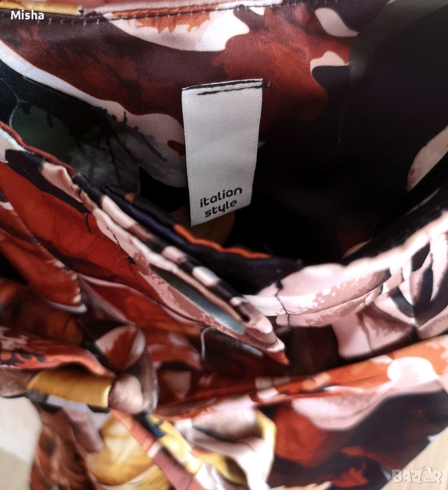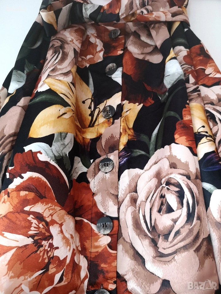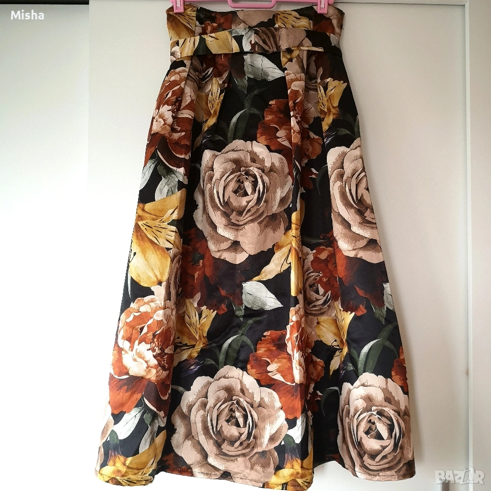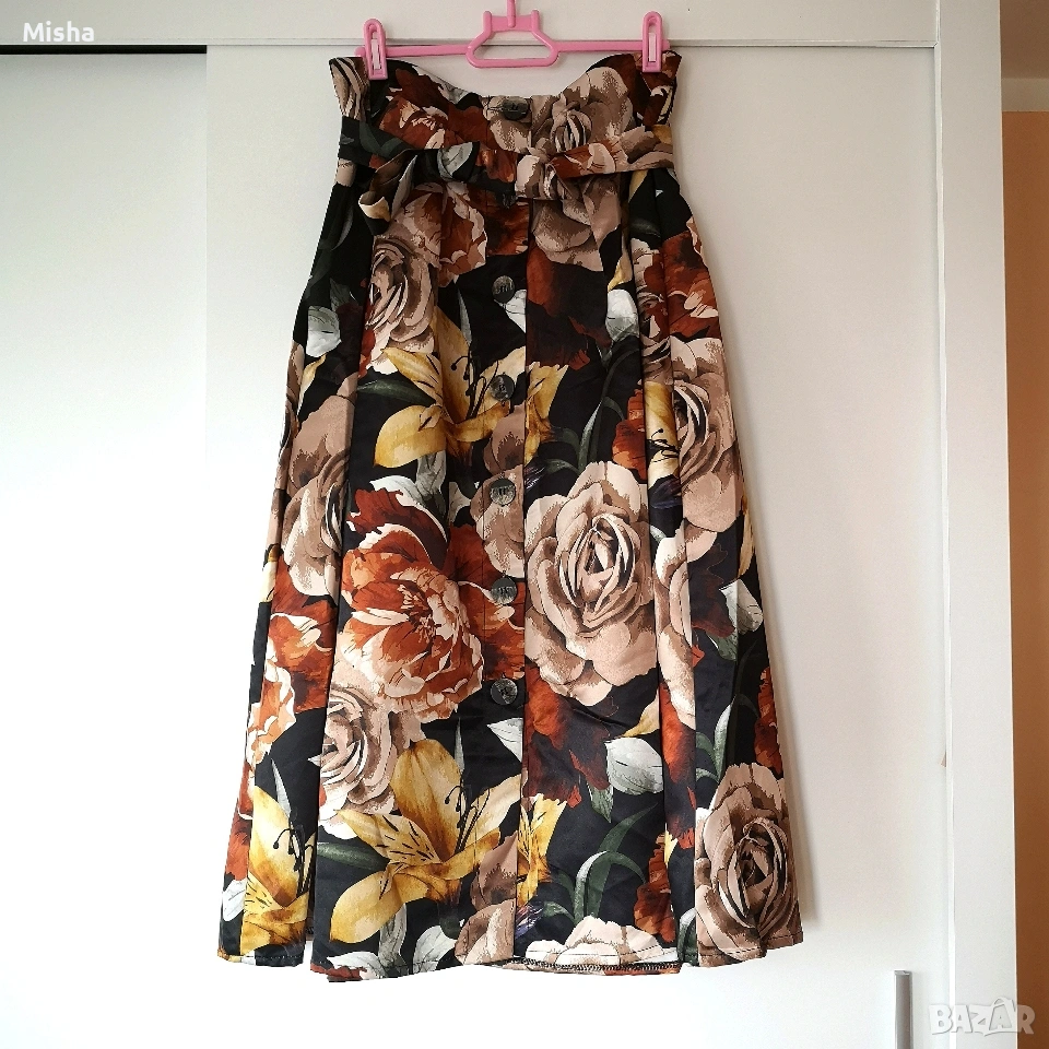 Красива дамска сатенена пола в есенни цветове на цветята, с копчета и пришит колан. Слагана е 1-2 пъти. Няма забележки. Според мен отговаря на размер S-M.