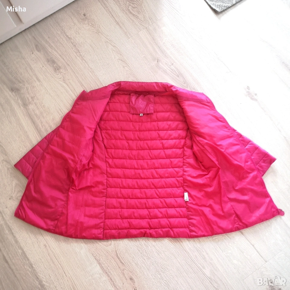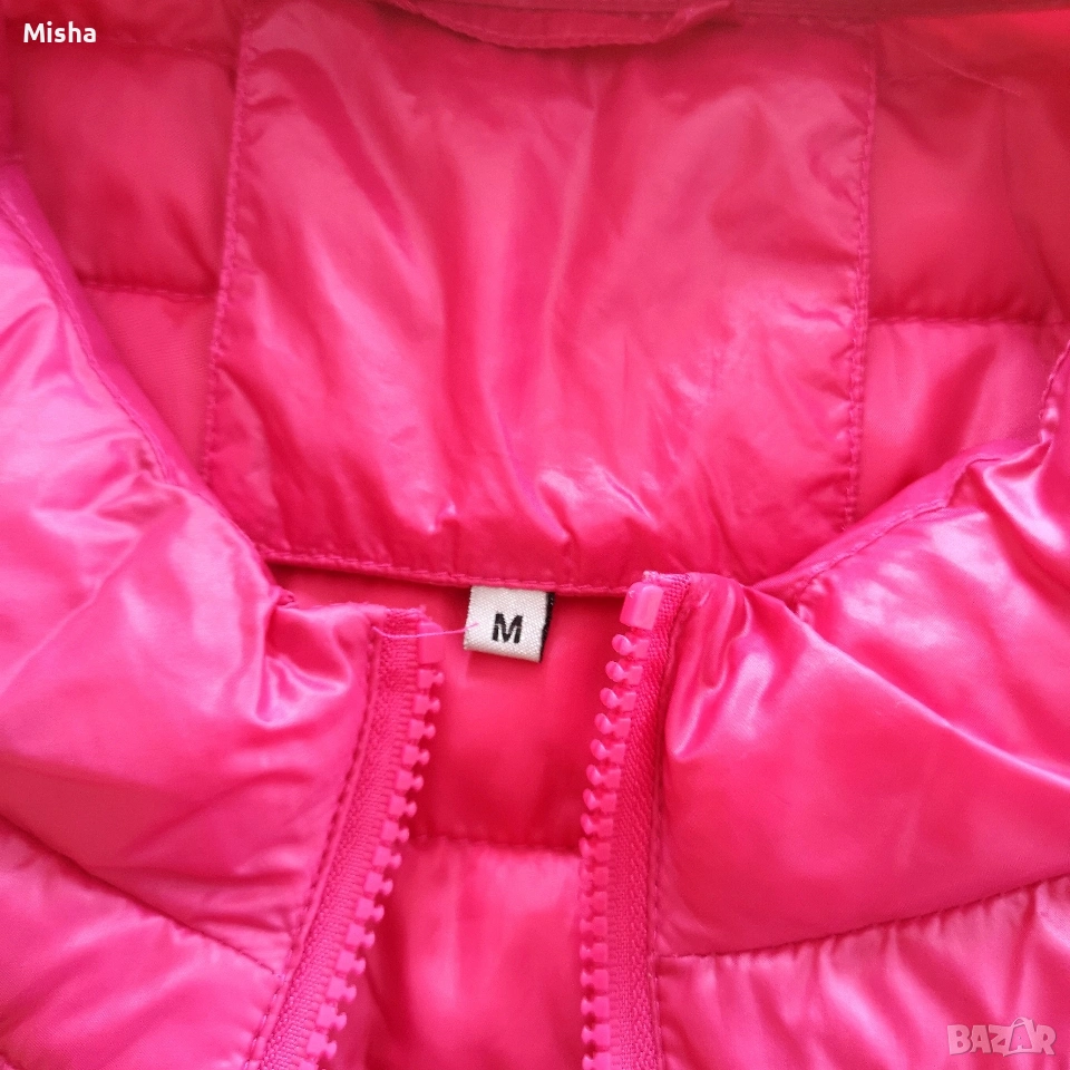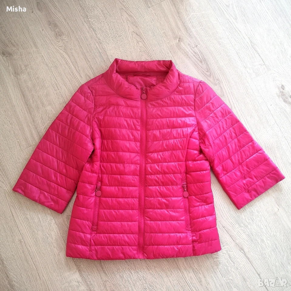 Дамско олекотено преходно яке в цвят фуксия, размер М, ръкавите са с дължина 7/8, ниска яка, закопчаване с цип, джобчета с ципове. Използвано е, но е здраво. Размери: от рамо до рамо 42см, подмишници 47см, дължина 59см, дължина на ръкава 40см.