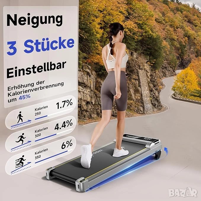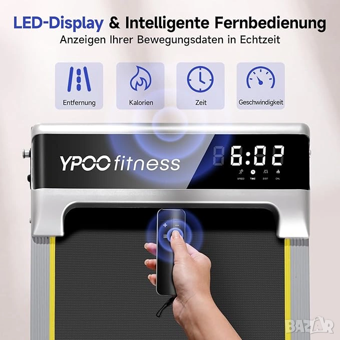 Подложка за ходене YPOO е оборудвана с 5 слоя неплъзгаща се повърхност , бягаща площ от 38 x 93 см, която може да издържи до 140 кг, за да подобри безопасността и комфорта на тренировката. С регулируема скорост от 1-6 км/ч, можете без усилие да превключвате между бягане и джогинг.