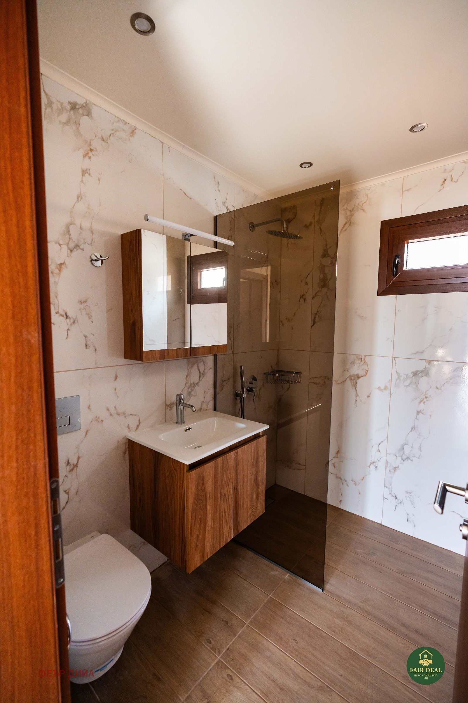 ℹ️ Къщата се намира в изискания комплекс Blue Sky във вилна зона Брацаки в Неа Кердиля, Аспровалта. Чистата й площ е 104 кв. метра.