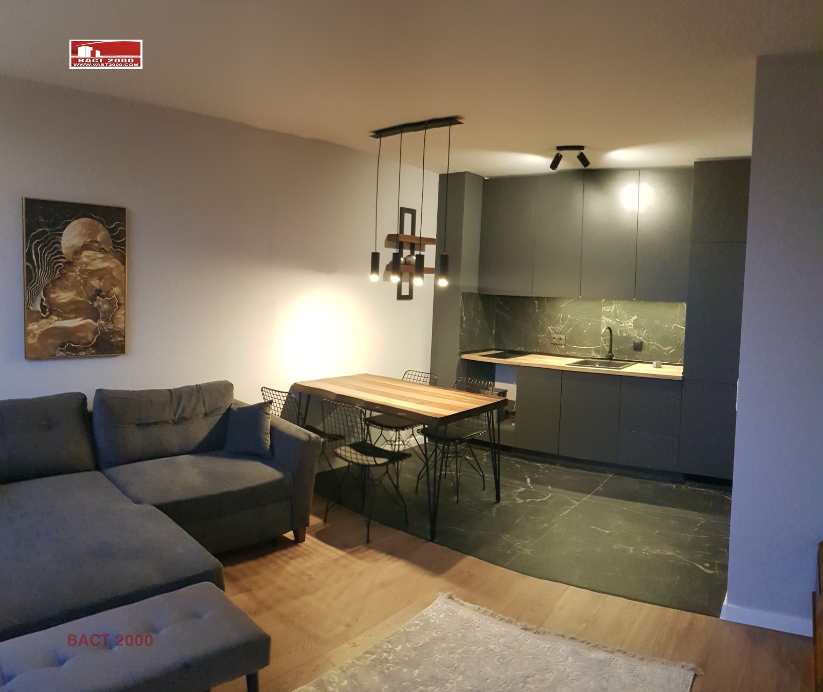 Стените са шпакловани и боядисани с латекс, подовите настилки са гранитогрес и паркет. Изцяло обзаведен - кухня с двуреди шкафове, хладилник, миялна, печка, пералня. Маса за хранене с четири стола, диван, спалня с гардероб и други малки мебели.