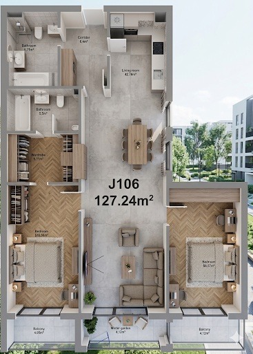 Спални: Основна спалня 16,96 кв.м със собствен дрешни 6 кв.м и собствена баня 5 кв.м, както и директен изход към уютен балкон.
