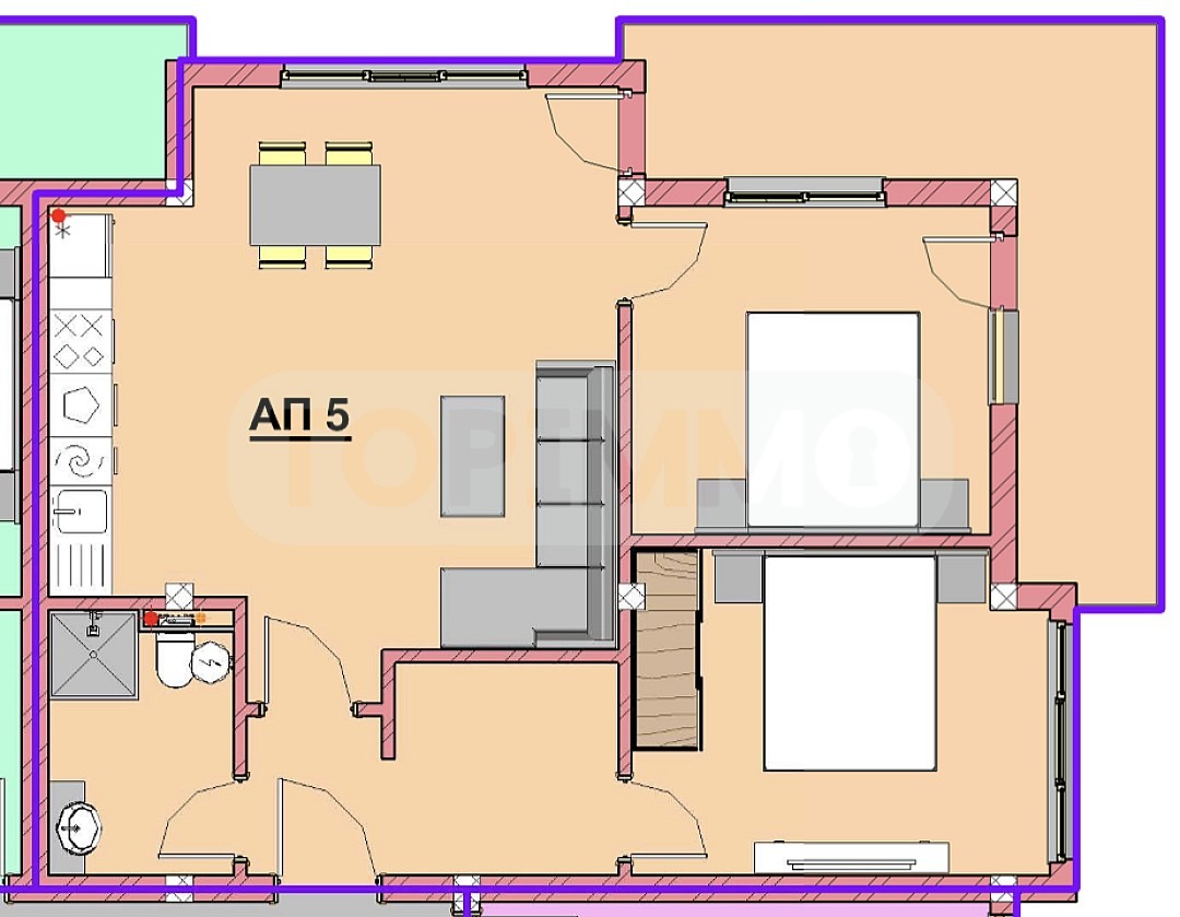 Апартаментът, който представяме е разположен на 2-ри етаж, с обща площ 92,93 кв.м и чиста площ 80,74 кв.м. Състои се от коридор, всекидневна с трапезария и кухня, две спални, две тераси и баня с тоалетна.