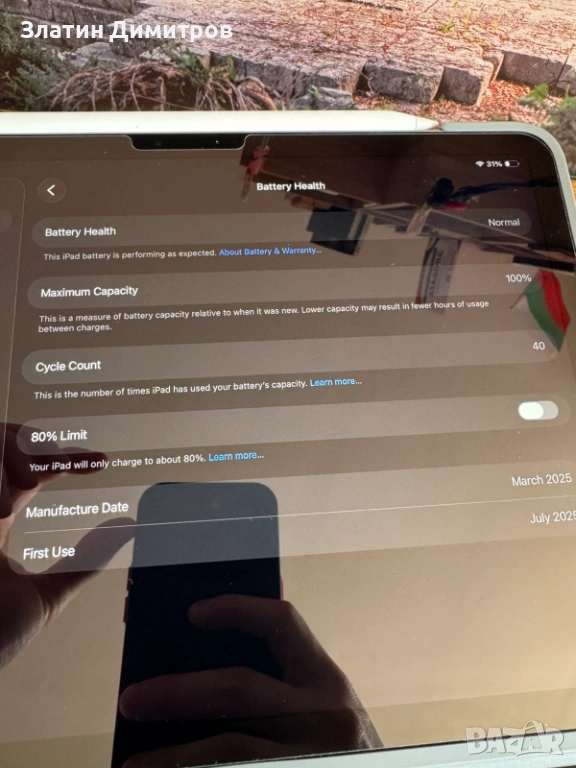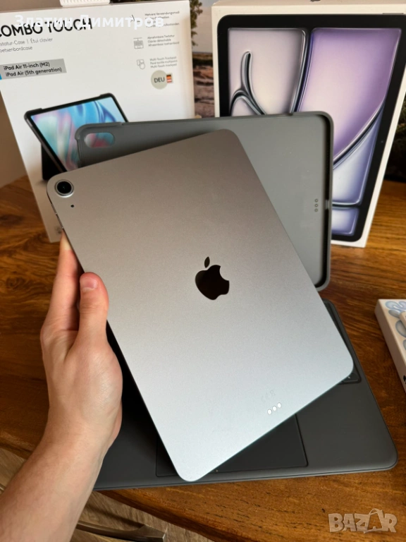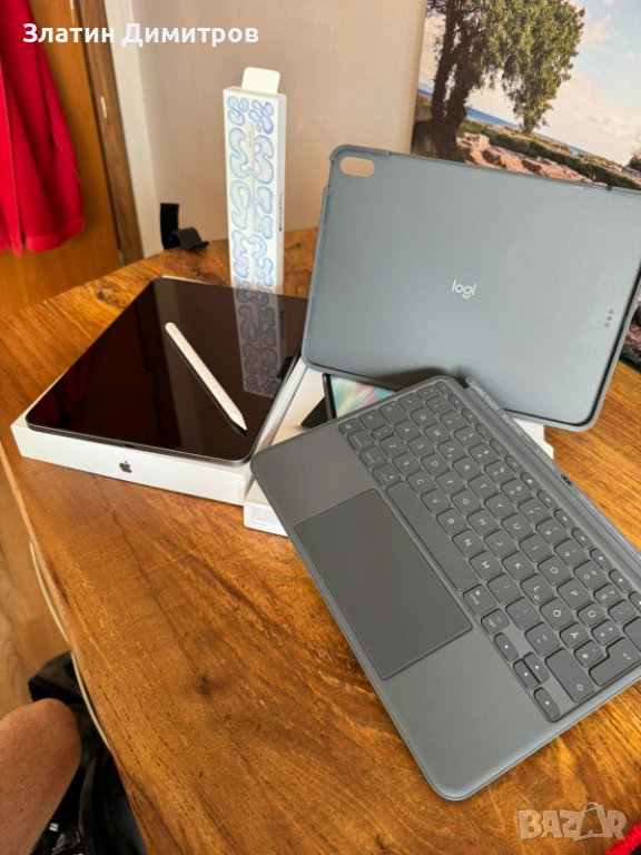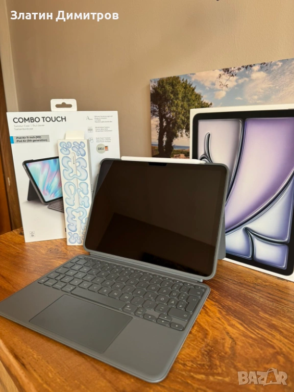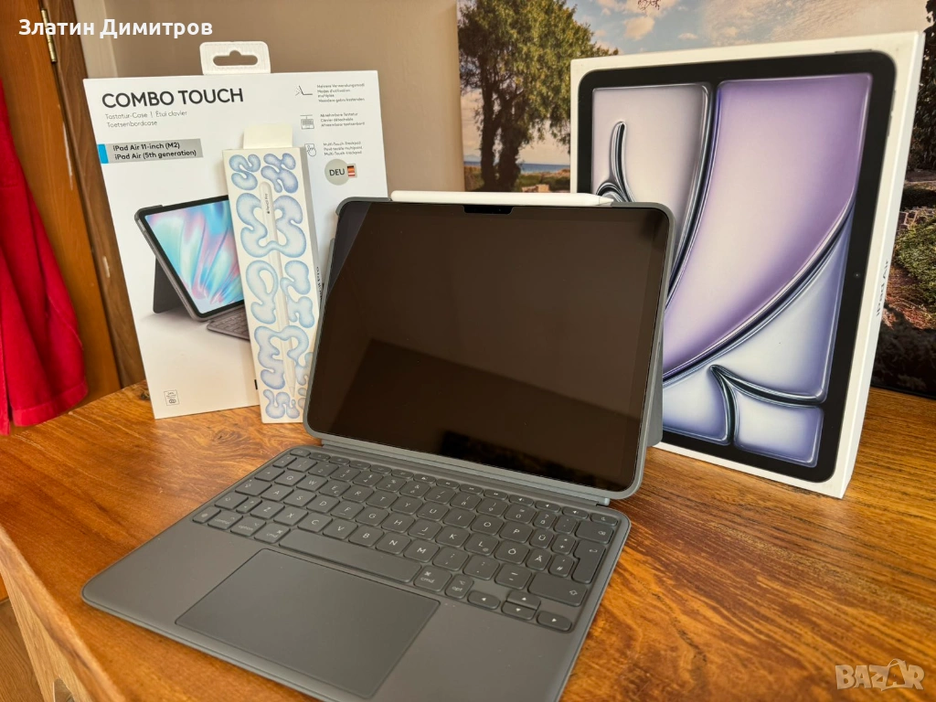 iPad Air 11-inch (M3), Apple Pencil Pro и Logitech Combo Touch клавиатура, всички закупени през 2025 г., оригинални и в отлично техническо и визуално състояние.