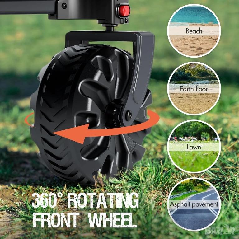 - Плажна количка с големи колела за пясък, всички теренни колела с TPR грайфер в средата могат лесно да преминават през пясък, цимент, гумени постелки и площадки без никакви проблеми. Проектирана с 360° въртящи се предни колела, които правят бутането и дърпането на сгъваемата количка лесно и удобно.