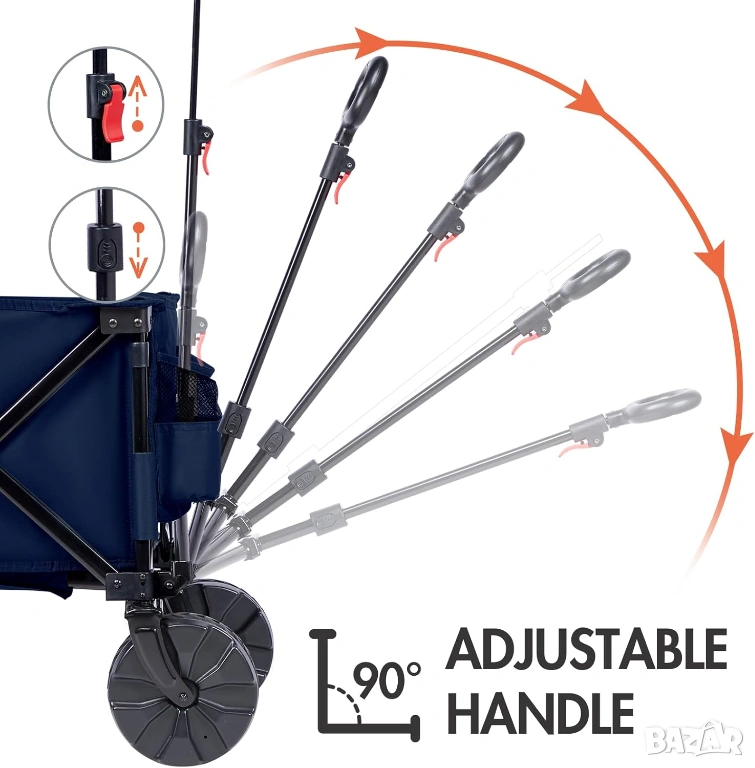 - Дължината на дръжката може да се удължава от 66 см до 81 см и да се регулира на 90 градуса напред и назад. Универсалната количка е практичен помощник при пране и пазаруване. Когато отивате в парка или на плажа, тя може да спести много време и енергия при транспортиране.