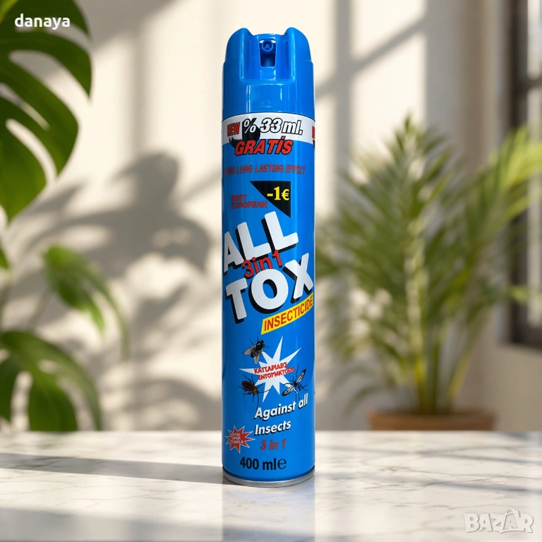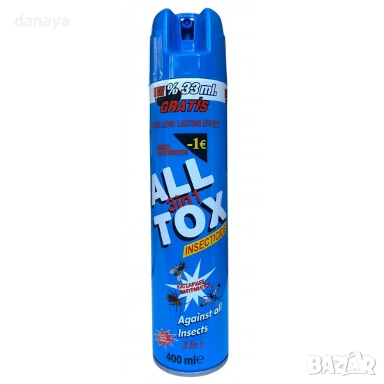 Ефикасрен спрей против насекоми ALL TOX 3в1 400 мл е практично решение за бързо и ефективно справяне с нежеланите насекоми у дома. Този аерозолен спрей действа срещу мухи, комари, хлебарки и други пълзящи и летящи насекоми, като осигурява незабавен ефект и продължителна защита.