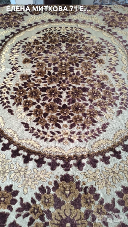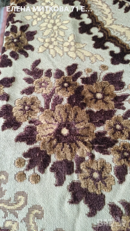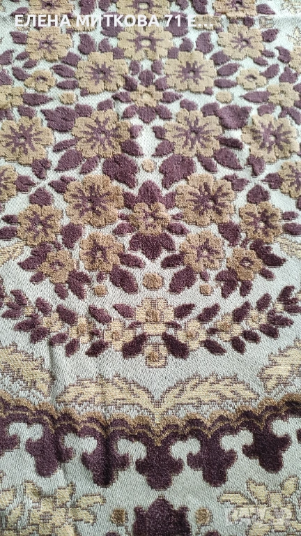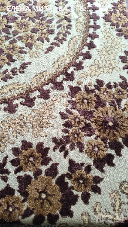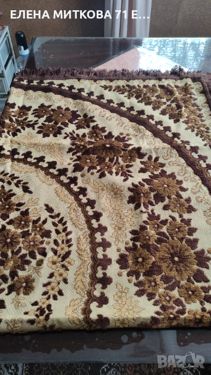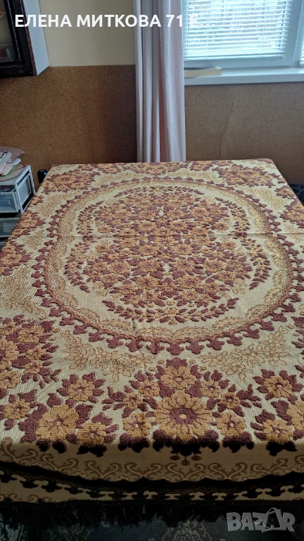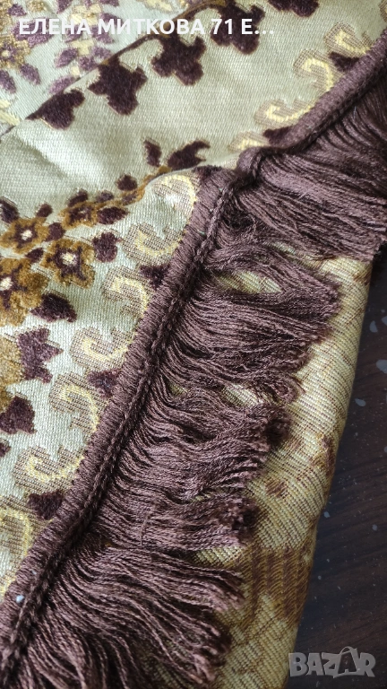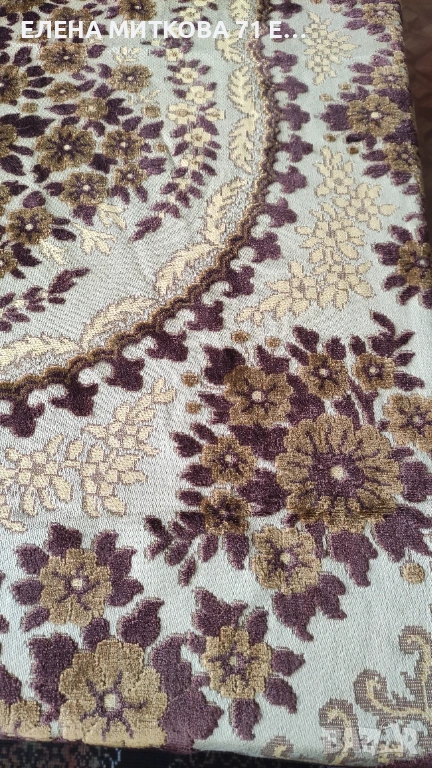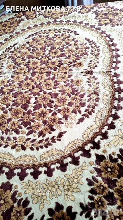 Тежка покривка за маса от едно време-с релефни плюшени флорални мотиви.С ресни.Цветовете са кафяво и нюанси на бежово.Много запазено състояние,без следи от употреба.Възможно е да не е ползвана въобще