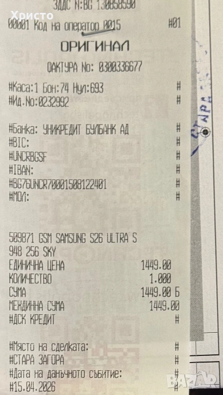Телефонът е чисто нов, неразпечатан и не е използван по никакъв начин. Закупен е на 15 Април 2026 година с 24 месеца гаранция към Технополис (платен в брой и няма опасност от заключване). Работи с всички оператори. Продава се с документи и подарък оригинален адаптер. Без бартери!!!