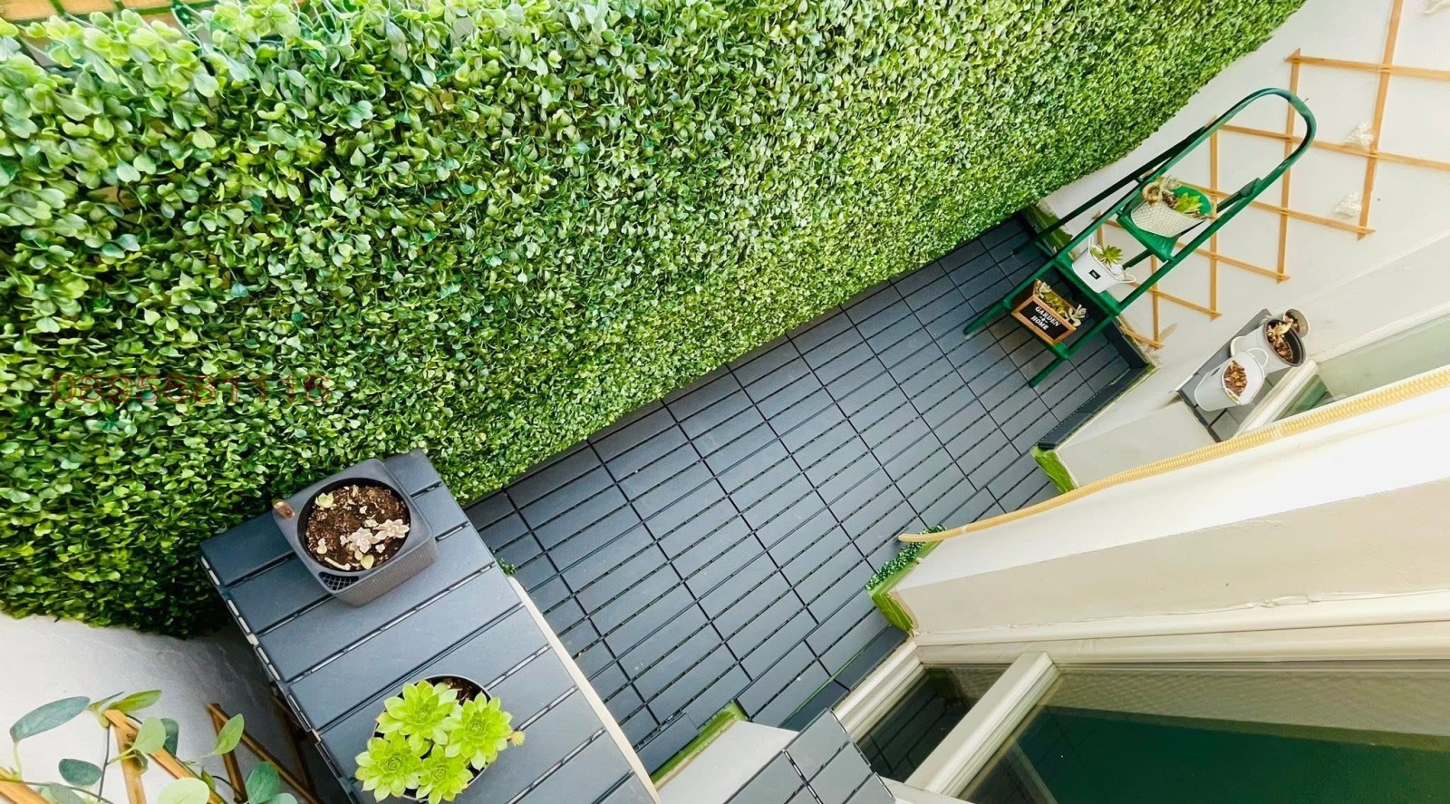 И трите тераси имат хидроизолация и са озеленени с вечно зелени растения, които са в кашпи Lechuza с вградена система за напояване с двойно дъно, което позволява да се полива веднъж седмично, вместо всеки ден.