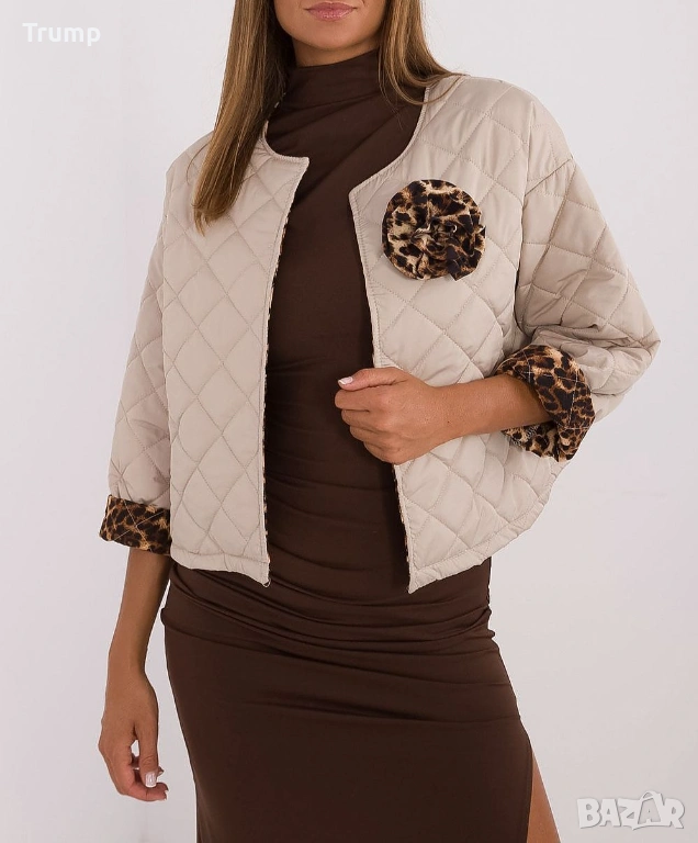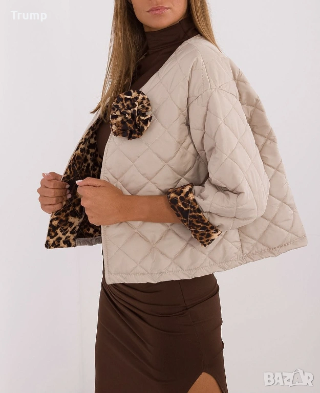 Отличителна черта е модерният животински принт на маншетите, добавящ елегантност и уникален характер.