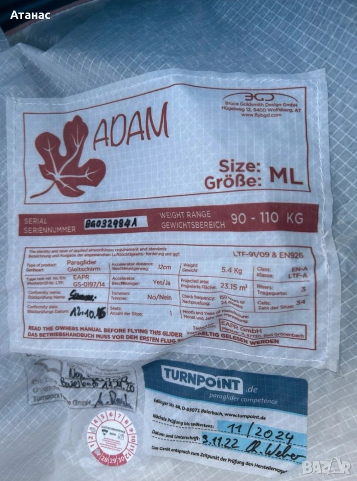 Парапланер BDG Adam ML 90-115kg EN-A → Обява 54214160