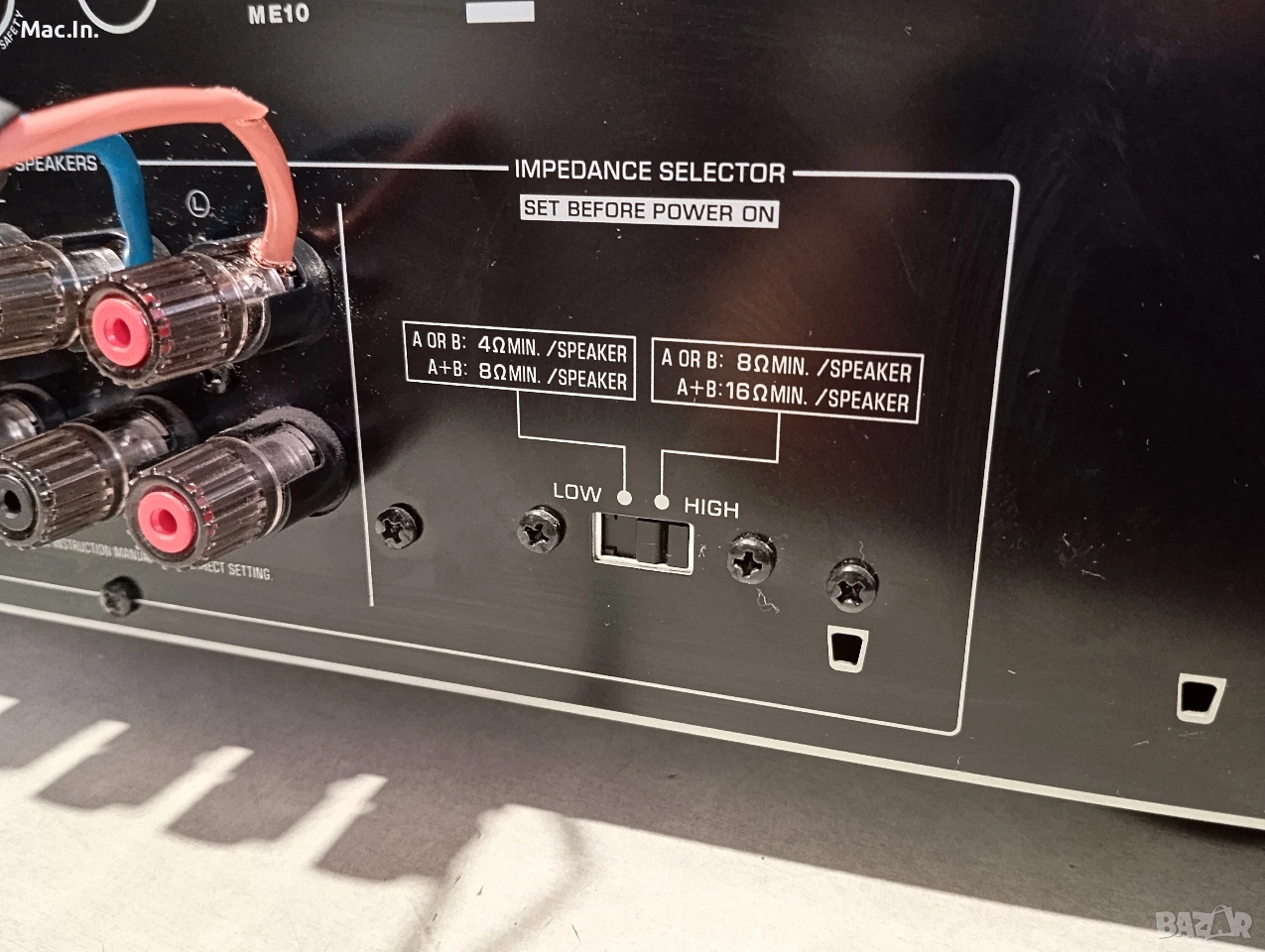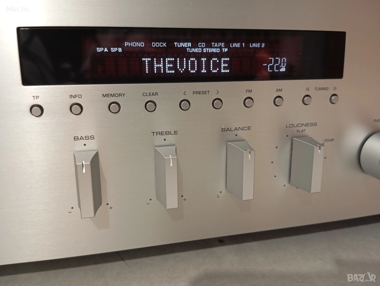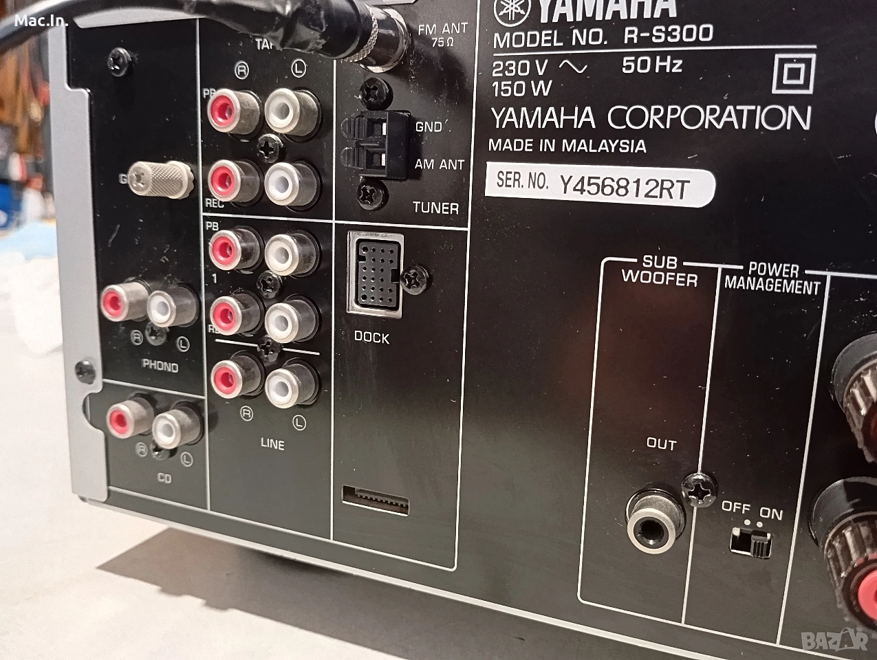 Машината е като нова, Модел: RS 300 Година на производство: 2010 - Произведено в: Сингапур]] Цвят: сребрист, черен Тип: Аналогов Дистанционно управление: Да Консумирана мощност: - Размери: 435 x 151 x 387 мм (Ш x В x Д) Тегло: 9 кг Връзки Брой входове: Фоно MM 3.0 mV/47 kOhm CD, 2x Линейни 200 mV/47 kOhm Докинг станция Yamaha за iPod/iPhone Брой изходи: 2x Rec-Out 200 mV/1.0 kOhm или по-малко. Слушалки 430 mV/470 ома 2x 2x високоговорителя (AB) Технически данни Непрекъсната мощност (при коефициент на изкривяване) 8 ома: 60 ​​вата при 0,019% THD 4 ома: 95 вата при 0,7% THD Динамична мощност 8 ома: 100 вата 6 ома: 120 вата 4 ома: 140 вата Общо хармонично изкривяване: 0,015 (30W 8 Ohm)