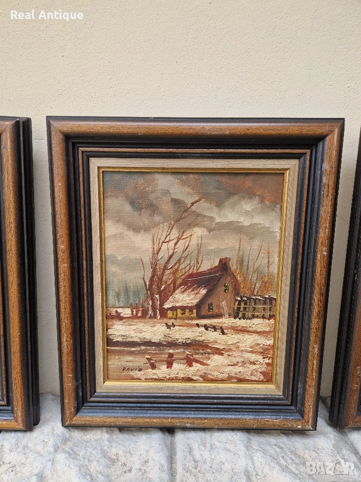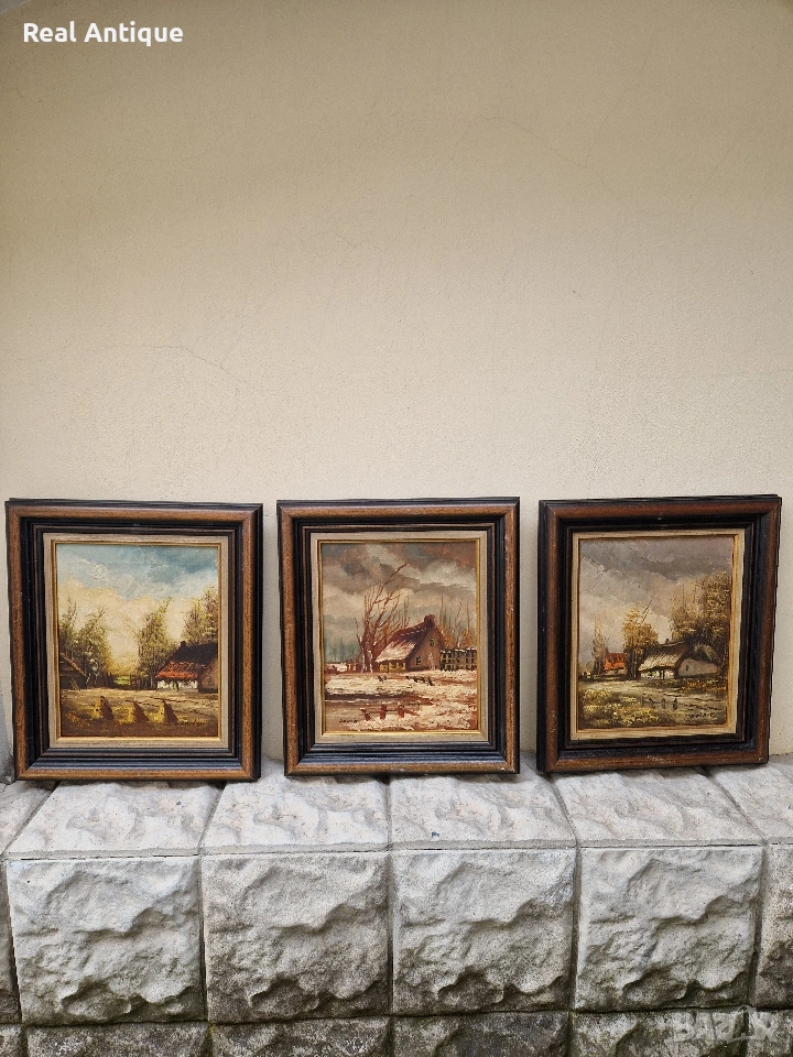 Продавам прекрасен лот от 3 броя антикварни белгийски авторски картини масло върху платно в много добро състояние със страхотни дървени рамки. И трите са от един автор. Размери 46 см на 36 см. Продават се и поотделно. Прекрасно допълнение към интериора на Вашия дом офис вила ресторант хотел. Подходящи и за подарък. Работя с всички куриери. Отговарям бързо.