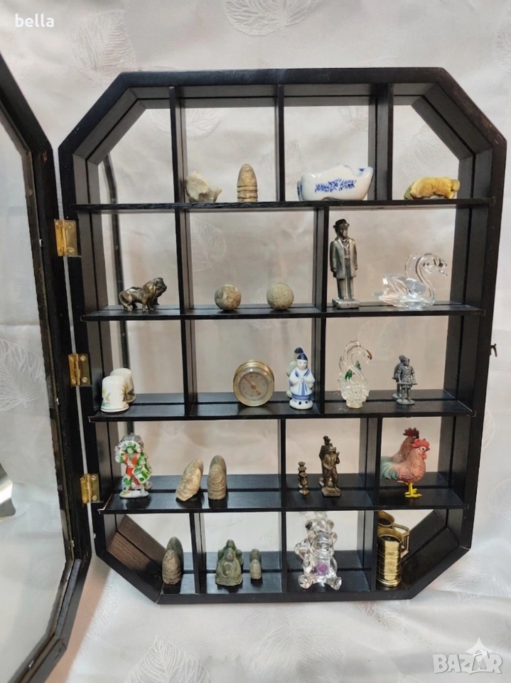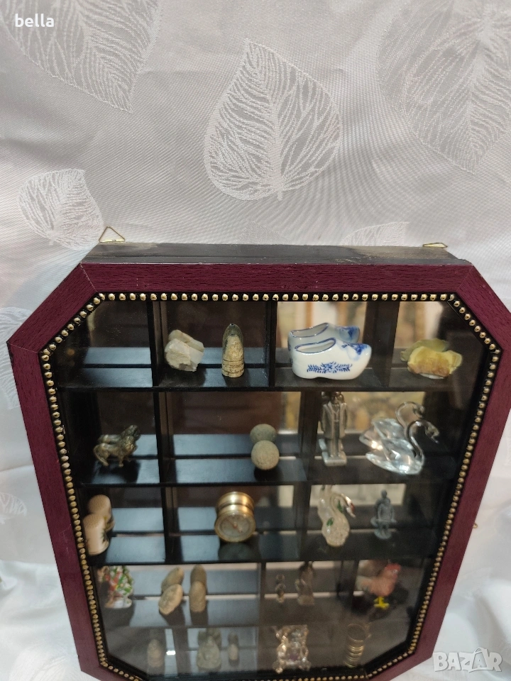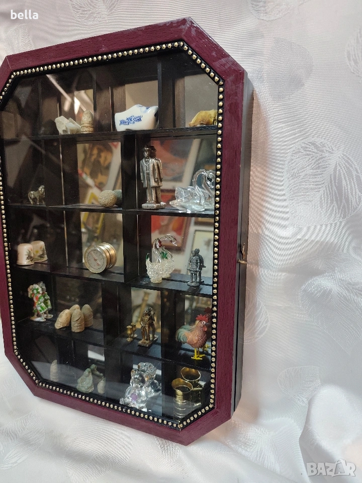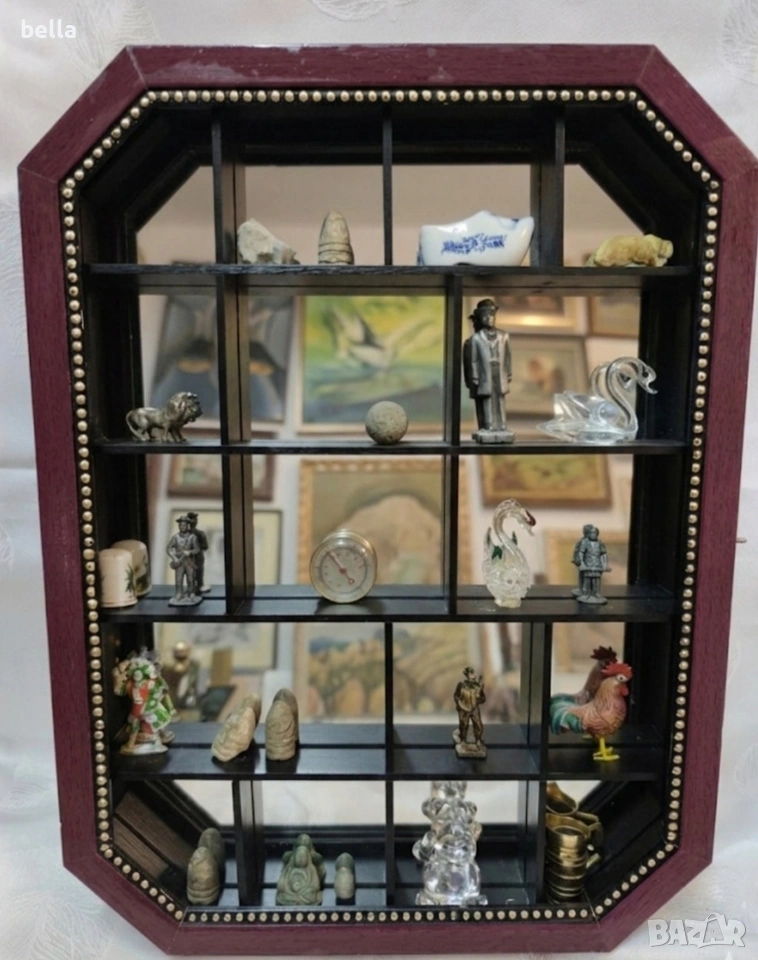Стенна витрина с огледален гръб за малки фигурки Дървена стенна витрина със стъклена вратичка и огледален заден панел, който придава дълбочина на предметите. Витрината е в отлично състояние и се продава без фигурките те са само за снимки. Витрината е готова за окачване. Идеална за декорация на дома или за ценители на дребни антикварни предмети.Размерите са 31/41/4,5 см Цена 75 евро