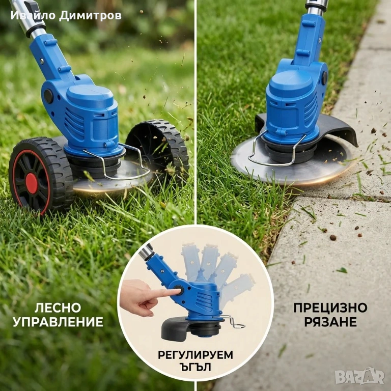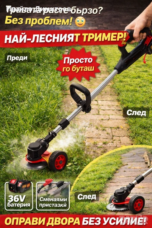 Акумулаторен тример за трева с колелца и 8 подаръка 36V 8A с телескопична дръжка