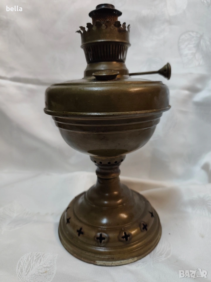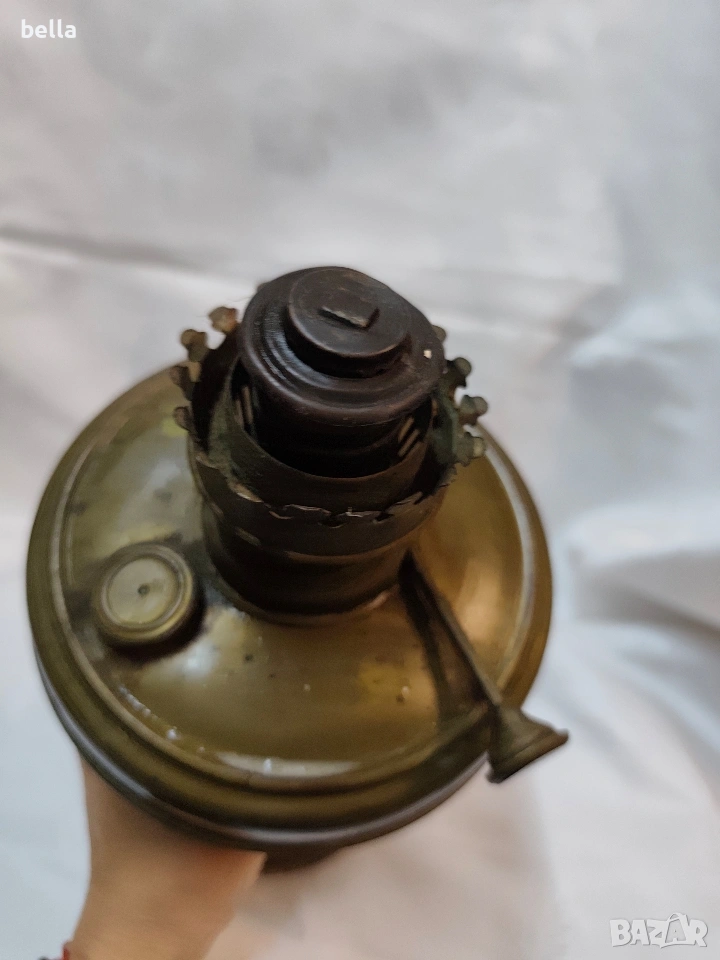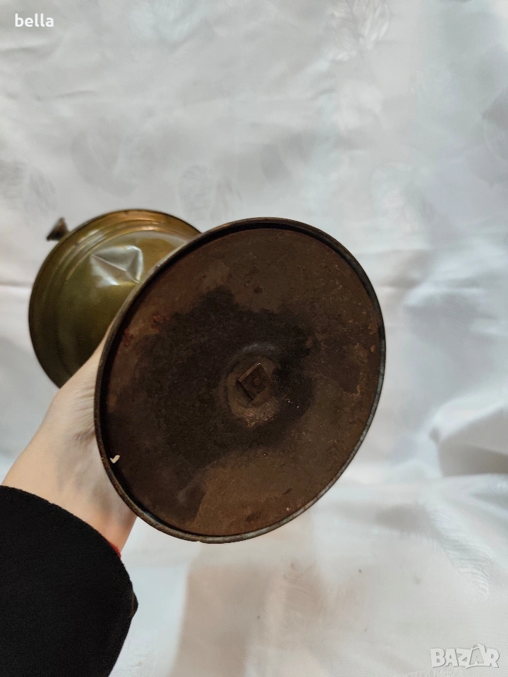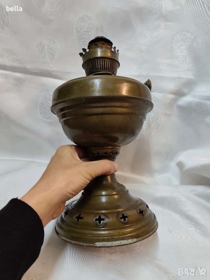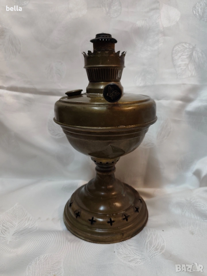 Стара антикварна месингова газена лампа – Маркировка „Пеперуда“ (Marquette), XIX век. Автентична антикварна газена лампа, изработена от масивен месинг. Лампата е изключително ценен модел за колекционери, благодарение на оригиналната си горелка с емблематичната маркировка „Пеперуда“ (символ на висококачествените френски и европейски производители като Marquette). Европейска майсторска изработка (Франция/Германия), края на XIX – началото на XX век. Масивен месинг с естествена историческа патина. Ръкохватката за фитила е с детайлно гравирана пеперуда – рядко срещан и търсен колекционерски елемент. Лампата е комплектна и здрава. По тялото има лека повърхностна вдлъбнатина, която подчертава автентичността и дългата история на предмета снимано е .Цена 65 евро
