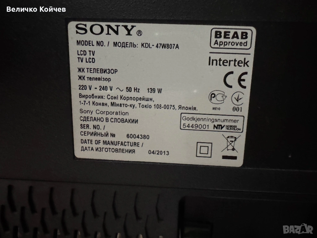 Телевизор Sony KDL-47W807A за ремонт! → Обява 54215123