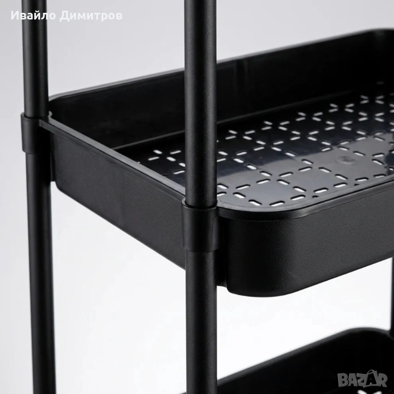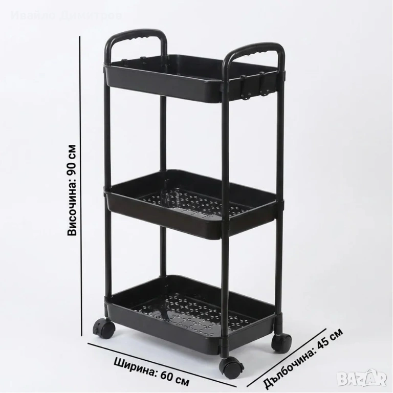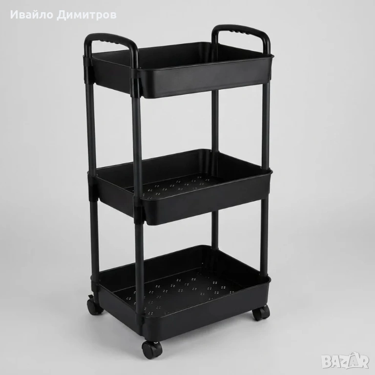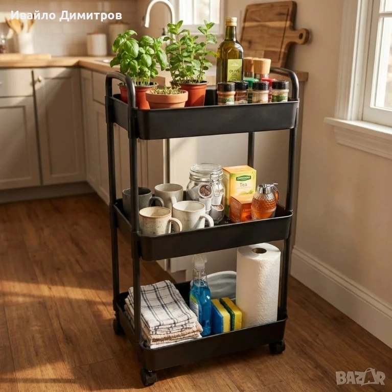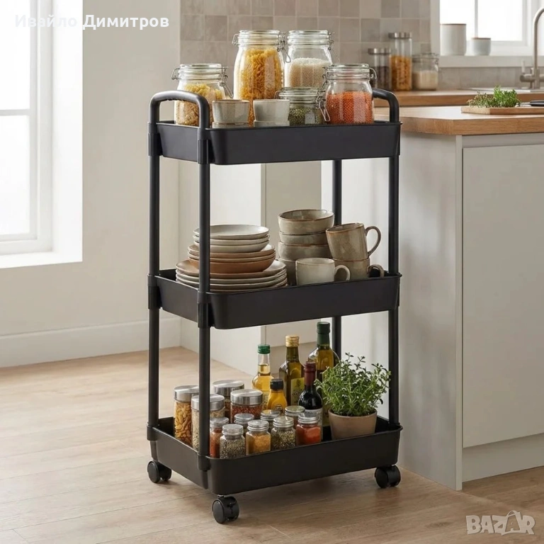 Многофункционална етажерка с три рафта, идеална за организиране на кухненски принадлежности.