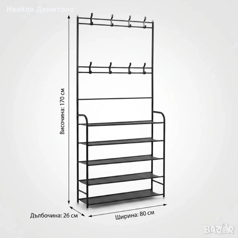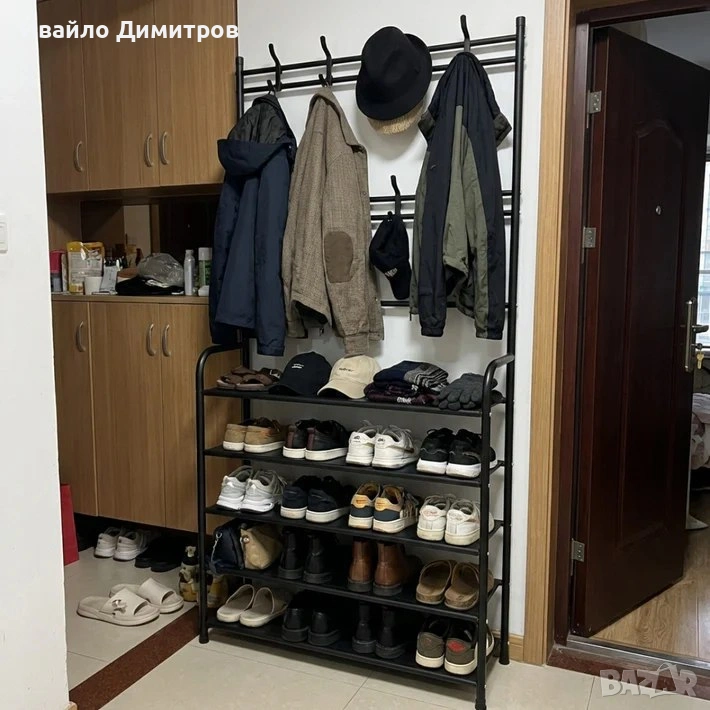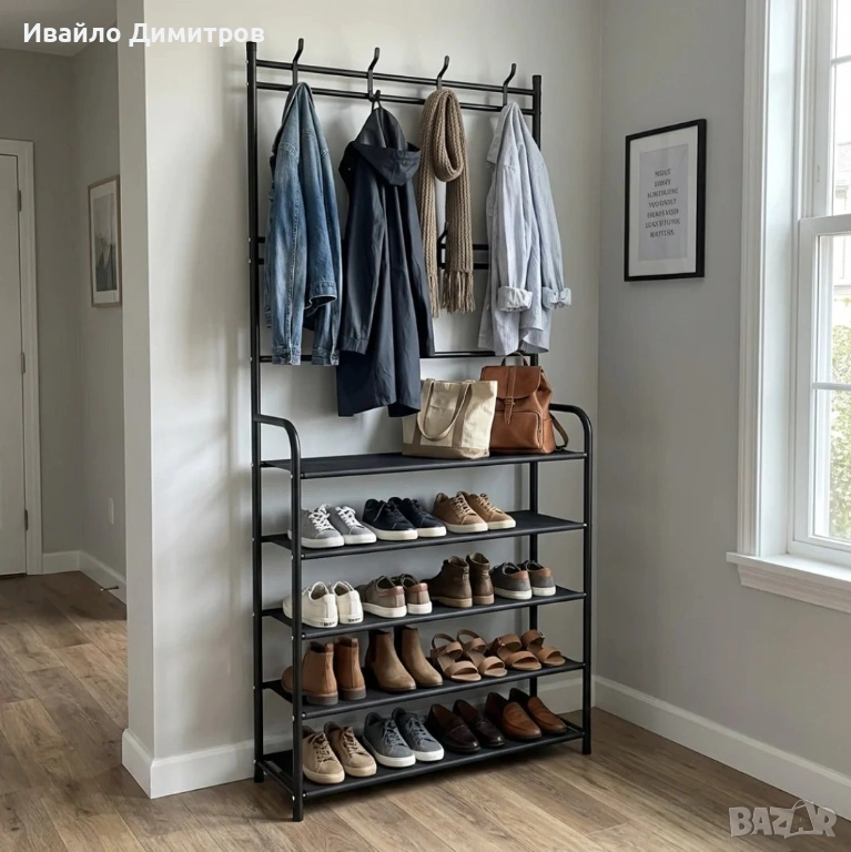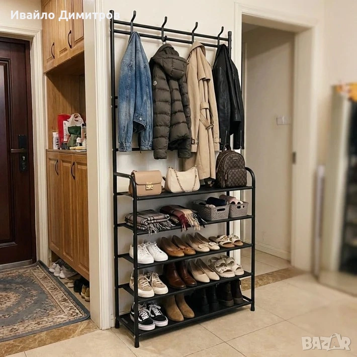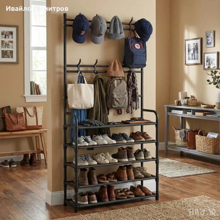 5-степенен рафт с 5 нива за обувки и 2 реда по 4 закачалки за дрехи, който осигурява удобно съхранение на обувки, дрехи и аксесоари.