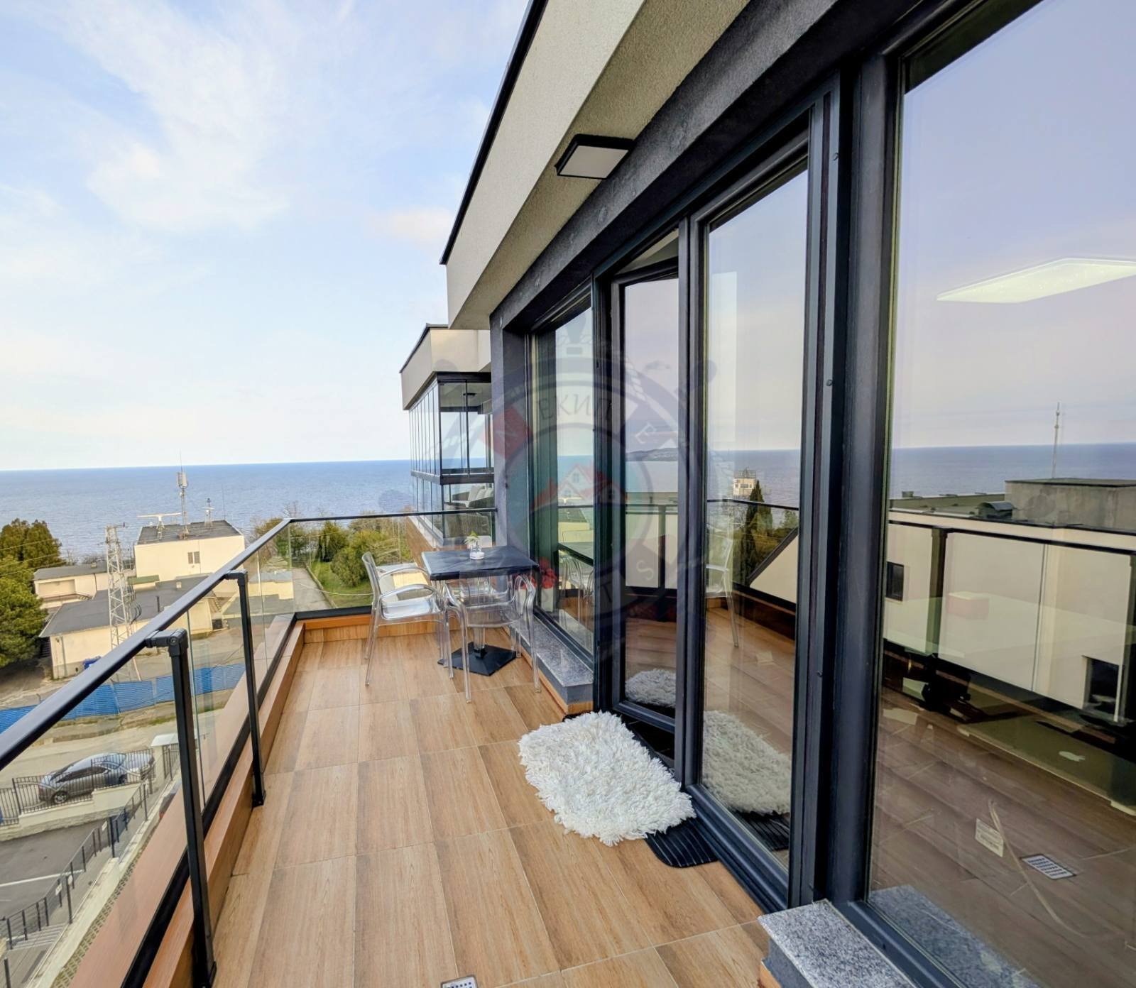 Апартаментът се състои от просторен дневен тракт с кухненска част, две спални, баня с тоалетна, втори санитарен възел - тоалетна и перално помещение, две големи панорамни тераси с излаз на тях от трите стаи и прилежаща изба. Разпределението на имота гарантира удобство и уют. Жилището е завършено с висококачествени материали. Продава се обзаведено и оборудвано с най-висок клас електроуреди и мебели по поръчка. Нескриваема морска панорама от всички стаи. Имотът е среден, топъл и разположен на четвърти жилищен етаж.