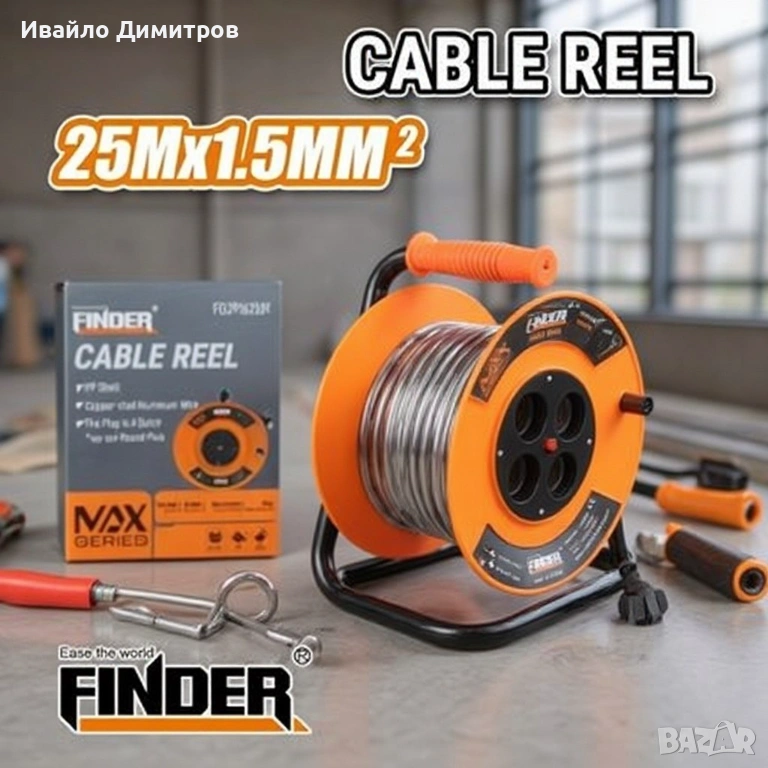 Макарата е оборудвана с 25-метров кабел с проводник 1.5 мм², който осигурява стабилно и безопасно подаване на електричество към свързаните уреди. Четирите гнезда позволяват едновременно включване на няколко електрически инструмента или устройства, което улеснява работата и спестява време.