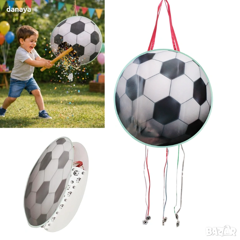 Пинятата за лакомства се пълни лесно с бонбони, малки играчки или изненади, а след това децата се забавляват, опитвайки се да я отворят. Подходяща е за рожден ден, тематично футболно парти или всяко събитие, където искате да внесете повече настроение и динамика.