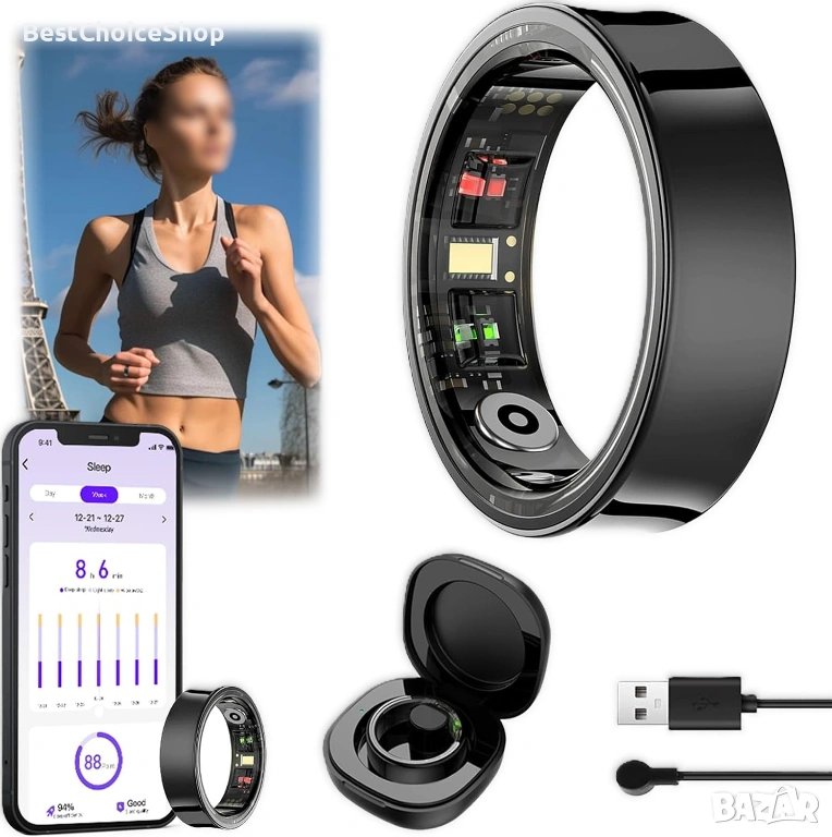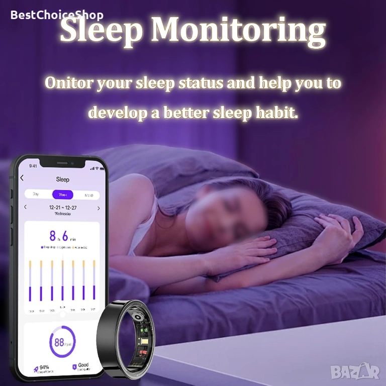 - 【Здравен пръстен】 Интелигентният здравен пръстен може да следи сърдечната ви честота и кръвното ви налягане по всяко време с едно щракване в приложението, което ви позволява да разберете по-добре физическото си състояние и да направите съответните корекции. Вграденият автоматичен тракер на съня може да следи състоянието на съня ви и да предостави цялостен анализ на качеството на съня (дълбок сън, лек сън и време за събуждане), което ви позволява да развиете добри навици за сън.