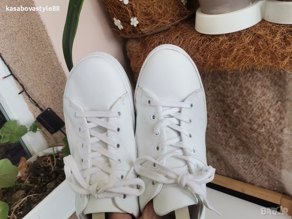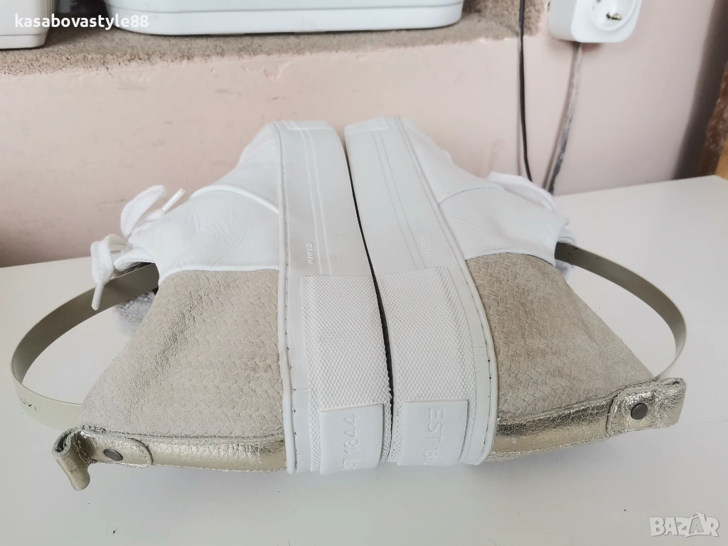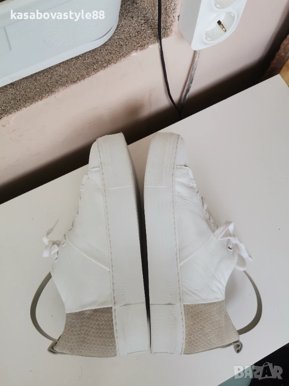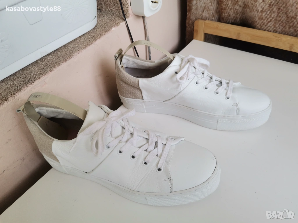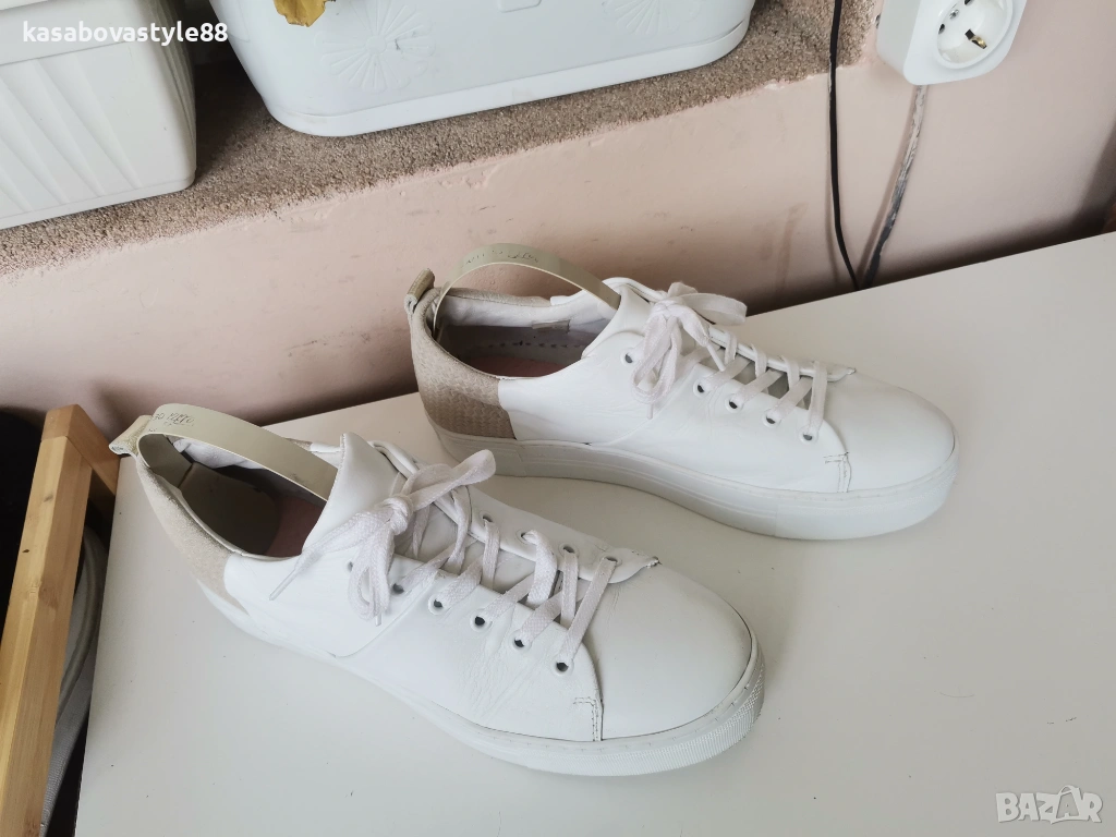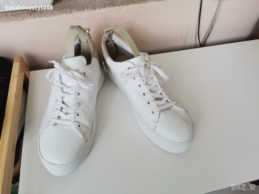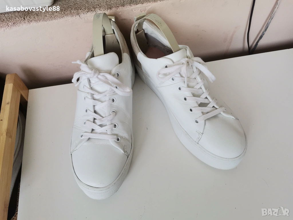 Дамски висококачествени спортни обувки в бял цвят, златисти елементи и велур отзад при петата, направени изцяло от естествена кожа включително и вътрешната част.Състояние-отлично!! Те са с изчистен дизайн, дебела платформа и връзки. Вътрешността е с комфортна вадеща стелка от антибактетиален хастар. Горната част на ходилото е шита, осигурявайки повече издръжливост и качество с височина отзад 3.7см. Моделът се води 42 н. но отговарят на 41.Дължина на стелка 27 см. Цялостна височина отзад 11см.