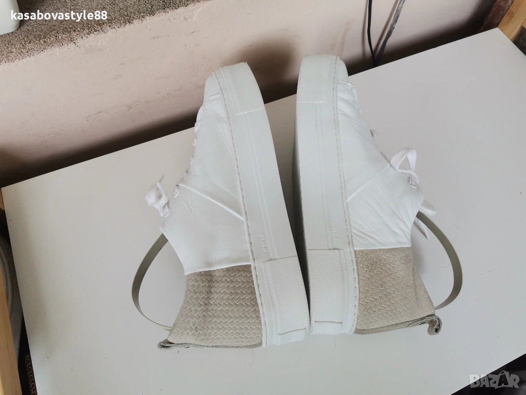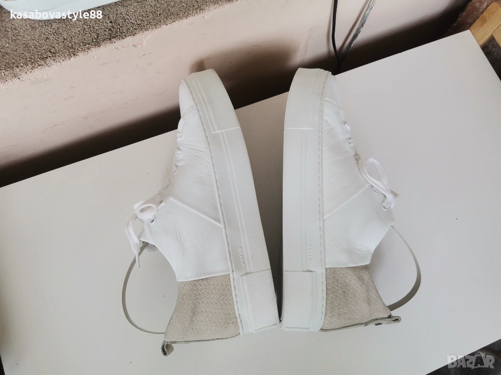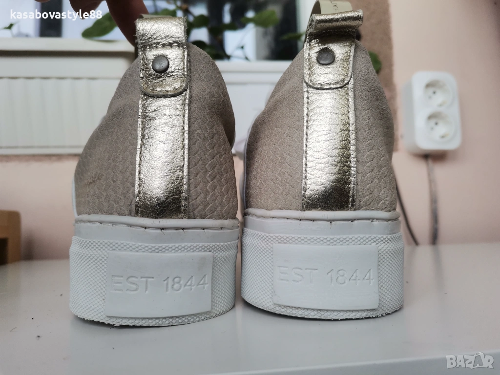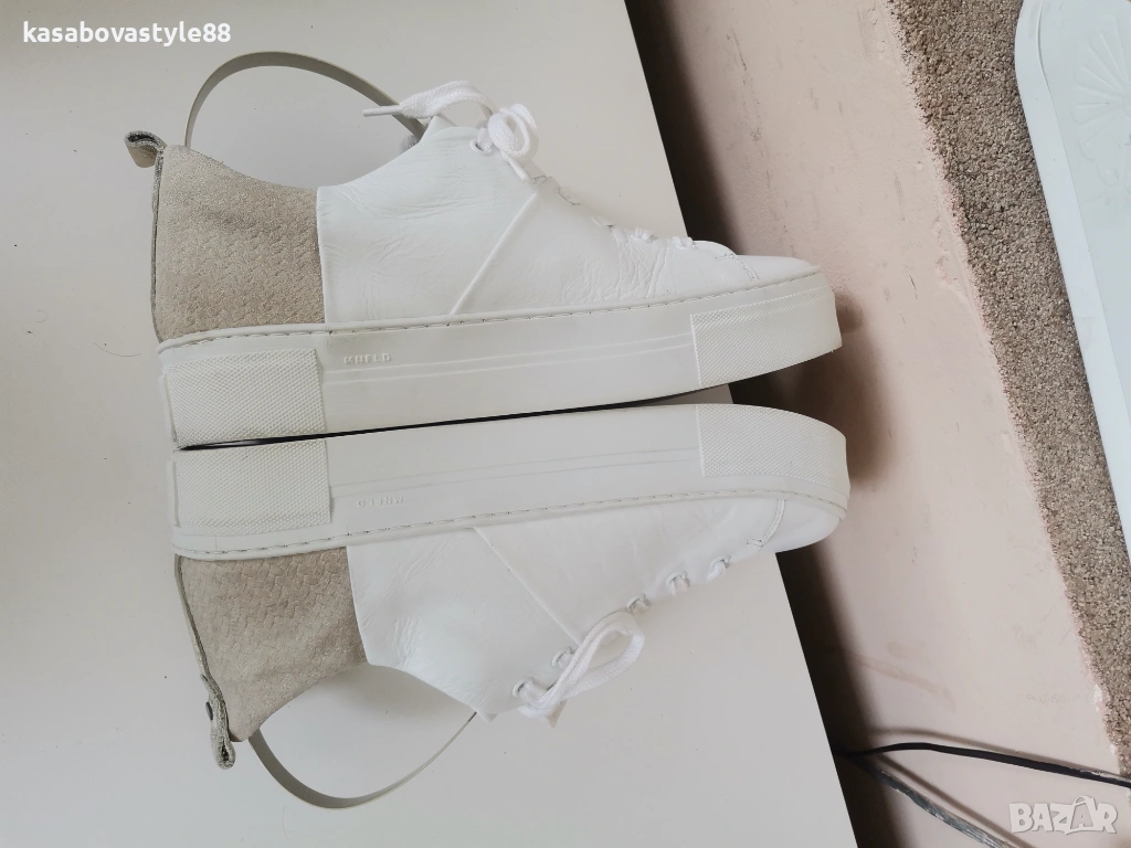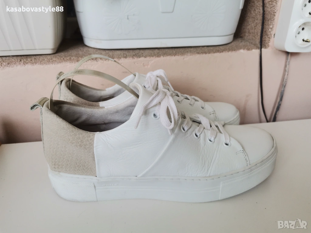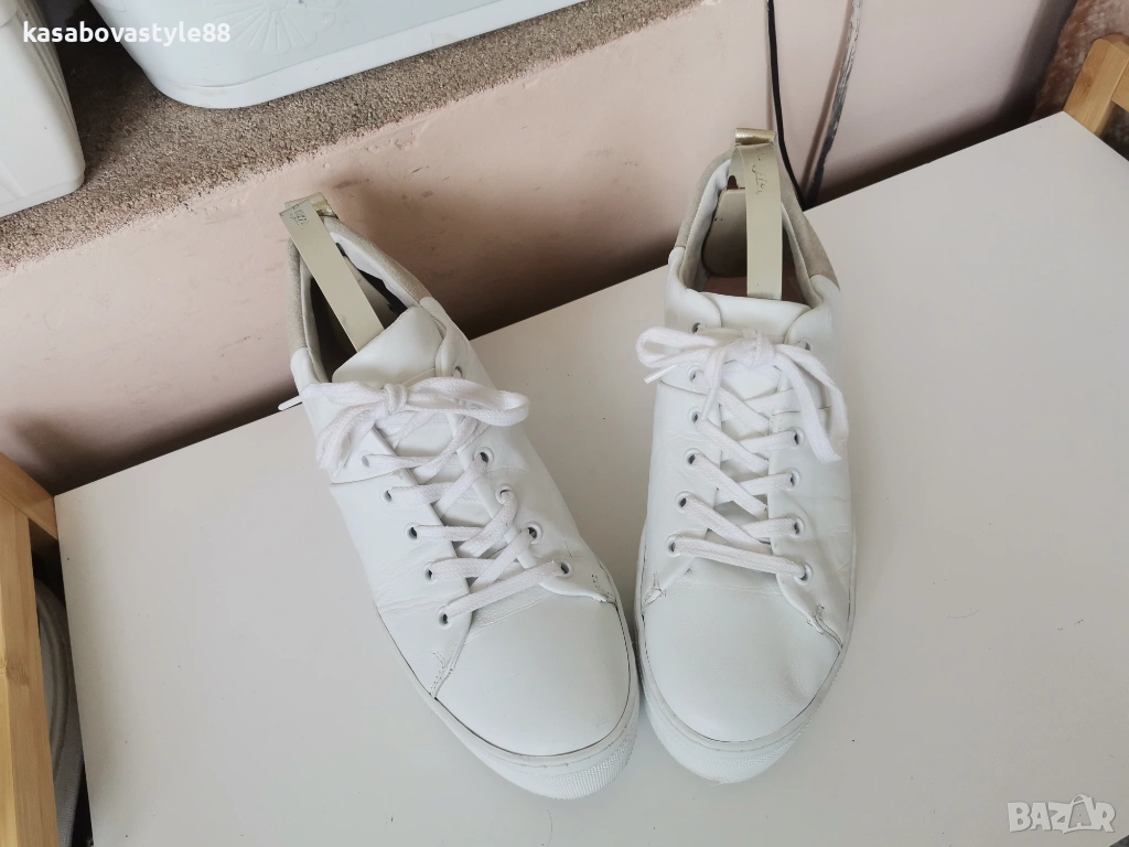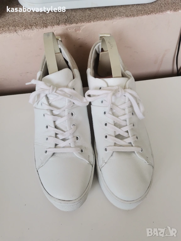 Дамски висококачествени спортни обувки в бял цвят, златисти елементи и велур отзад при петата, направени изцяло от естествена кожа включително и вътрешната част.Състояние-отлично!! Те са с изчистен дизайн, дебела платформа и връзки. Вътрешността е с комфортна вадеща стелка от антибактетиален хастар. Горната част на ходилото е шита, осигурявайки повече издръжливост и качество с височина отзад 3.7см. Моделът се води 42 н. но отговарят на 41.Дължина на стелка 27 см. Цялостна височина отзад 11см.