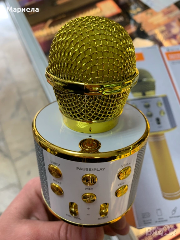 Bluetooth микрофона е с вграден високоговорител в златист метален вид - идеално за партита и подаръци.