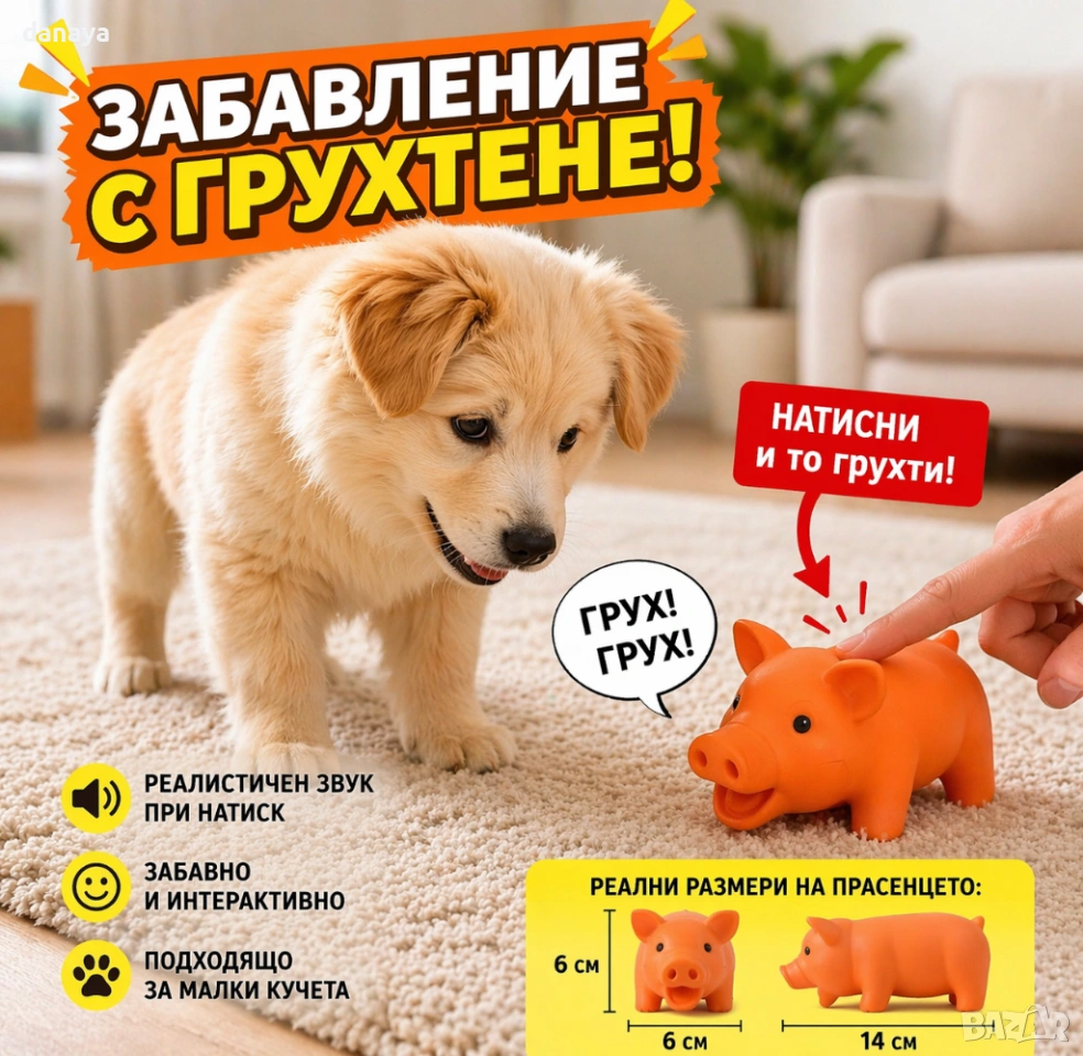 Забавление, което кучето ти няма да остави! Това сладко прасенце не е просто играчка – при всяко натискане издава реалистичен звук (грухти), който привлича вниманието и стимулира играта.