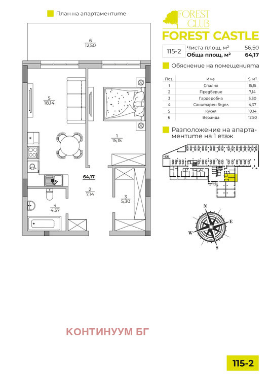 Продава се двустаен апартамент в строящ се жилищен комплекс Forest Castle модерен проект от висок клас, разположен сред зеленина и тишина.