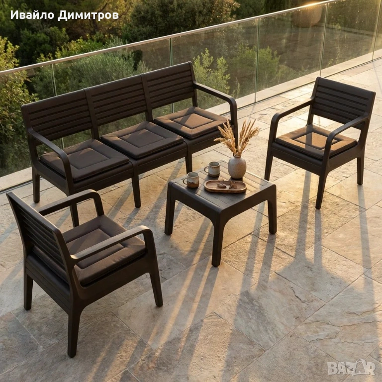 Комплектът е изработен от висококачествен полипропилен, подсилен с фибростъкло. Това го прави устойчив на слънце, дъжд и влага, без риск от ръжда или износване.