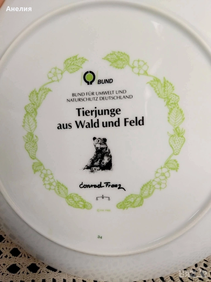 Нова! Колекцията "Tierjunge aus Wald und Feld" (Млади животни от гората и полето), проектирана от Конрад Франц за BUND (Bund für Umwelt und Naturschutz Deutschland). Чинията е част от колекция, посветена на дивите животни, като на нея е изобразено мече.Колекцията е създадена в сътрудничество с германската природозащитна организация BUND. Има приспособление за закачване на стена. Цена 15€/29.34 лв