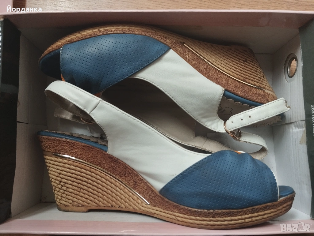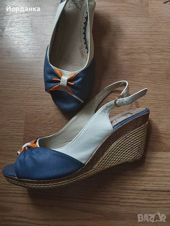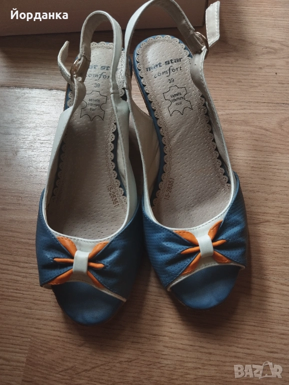 Продавам изключително симпатични и леки дамски сандали на платформа от серията Comfort на българската марка Mat Star. Обувките са с модерен "navy" (моряшки) дизайн в синьо и бяло, допълнен от закачлив оранжев акцент тип панделка. 👗🎀